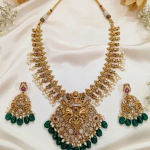 Antique Lakshmi Temple Necklace Set with Green Beads & Pearls