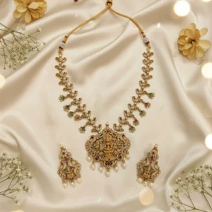 Traditional Lakshmi Temple Necklace Set with Ruby, Emerald & Pearl Drops