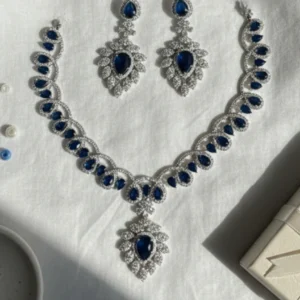Add a touch of royal elegance to your look with our stunning blue stone and diamond-look jewelry set. A timeless piece that`s perfect for brides or party wear.