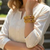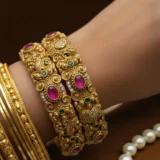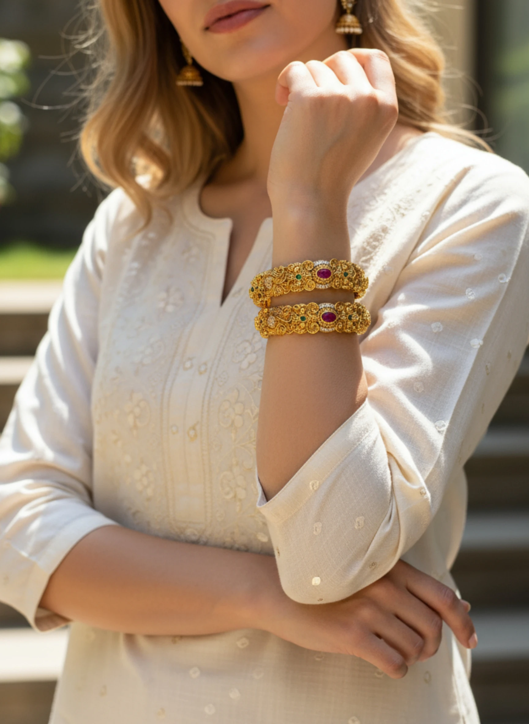Pair these antique bangles with a Kanchipuram or Banarasi saree, temple-style necklace, and jhumkas for a complete regal look. For modern fusion, wear a single bangle on each hand with a silk kurta set for understated elegance.