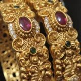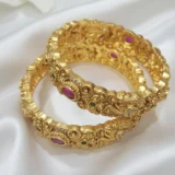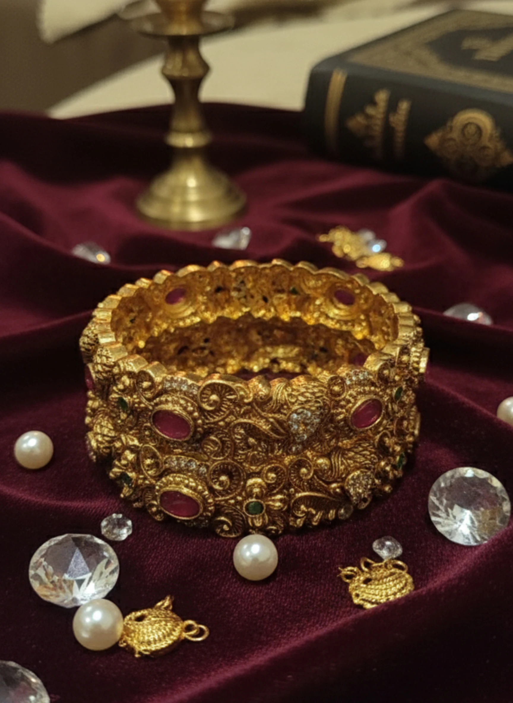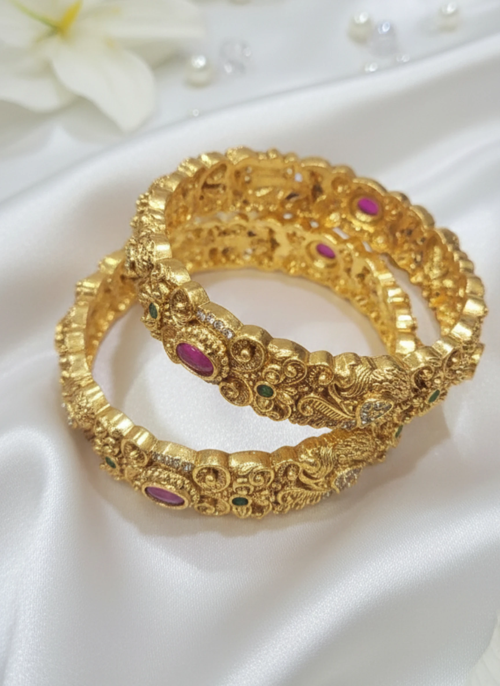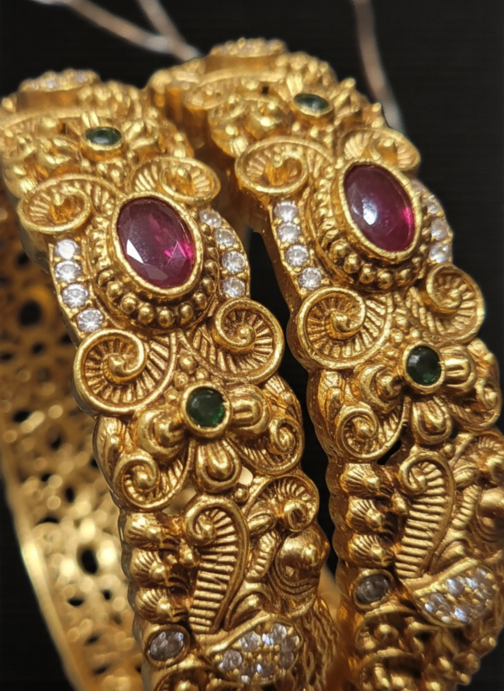 Inspired by timeless temple jewelry artistry, these bangles flaunt hand-carved peacock motifs, traditional floral scrolls, and embedded ruby & green Kemp stones. The antique texture gives them an old-world charm, while the brilliant CZ accents bring a touch of modern sparkle — creating a perfect blend of heritage and glamour.