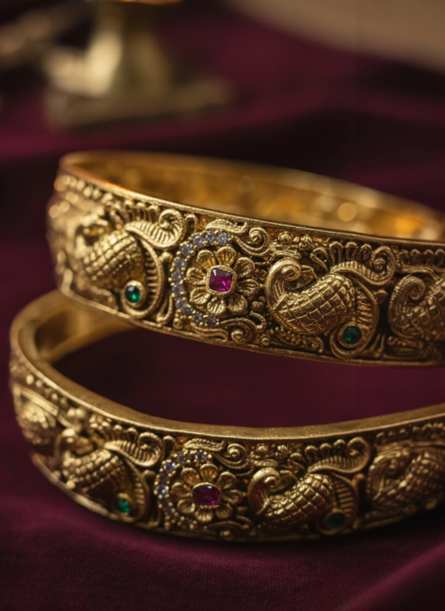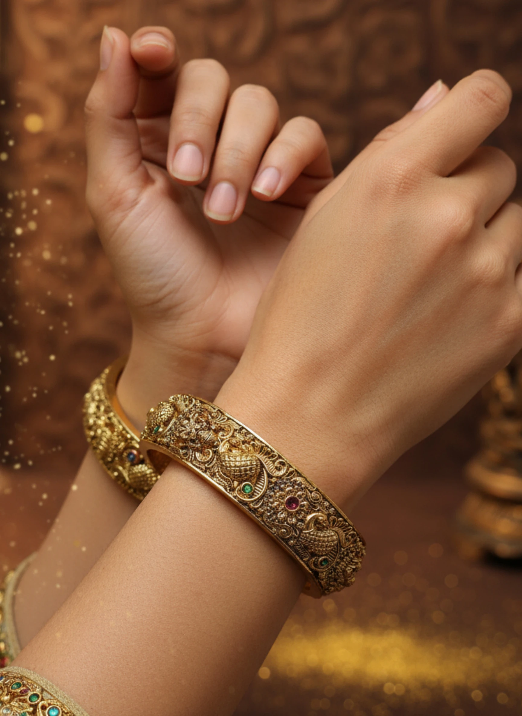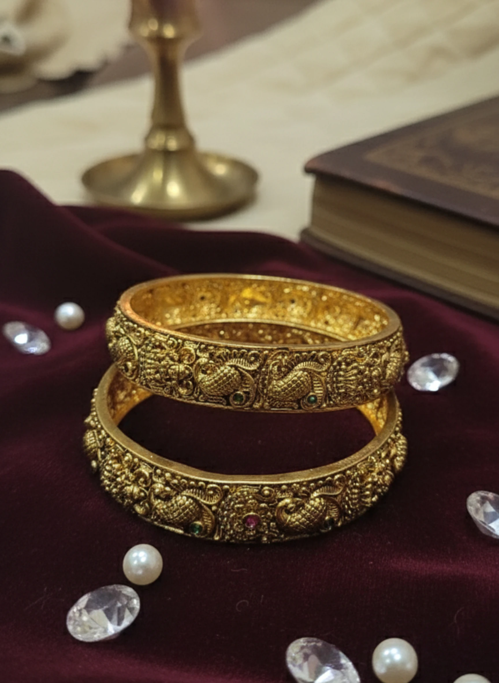 Inspired by temple art, each bangle features Goddess Lakshmi seated on a lotus, framed by peacock and floral motifs. The ruby and emerald stones alternate beautifully, enhancing the antique gold base. Every carving reflects traditional nakshi depth and sculptural detailing—turning these bangles into miniature pieces of temple architecture.