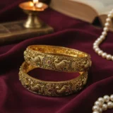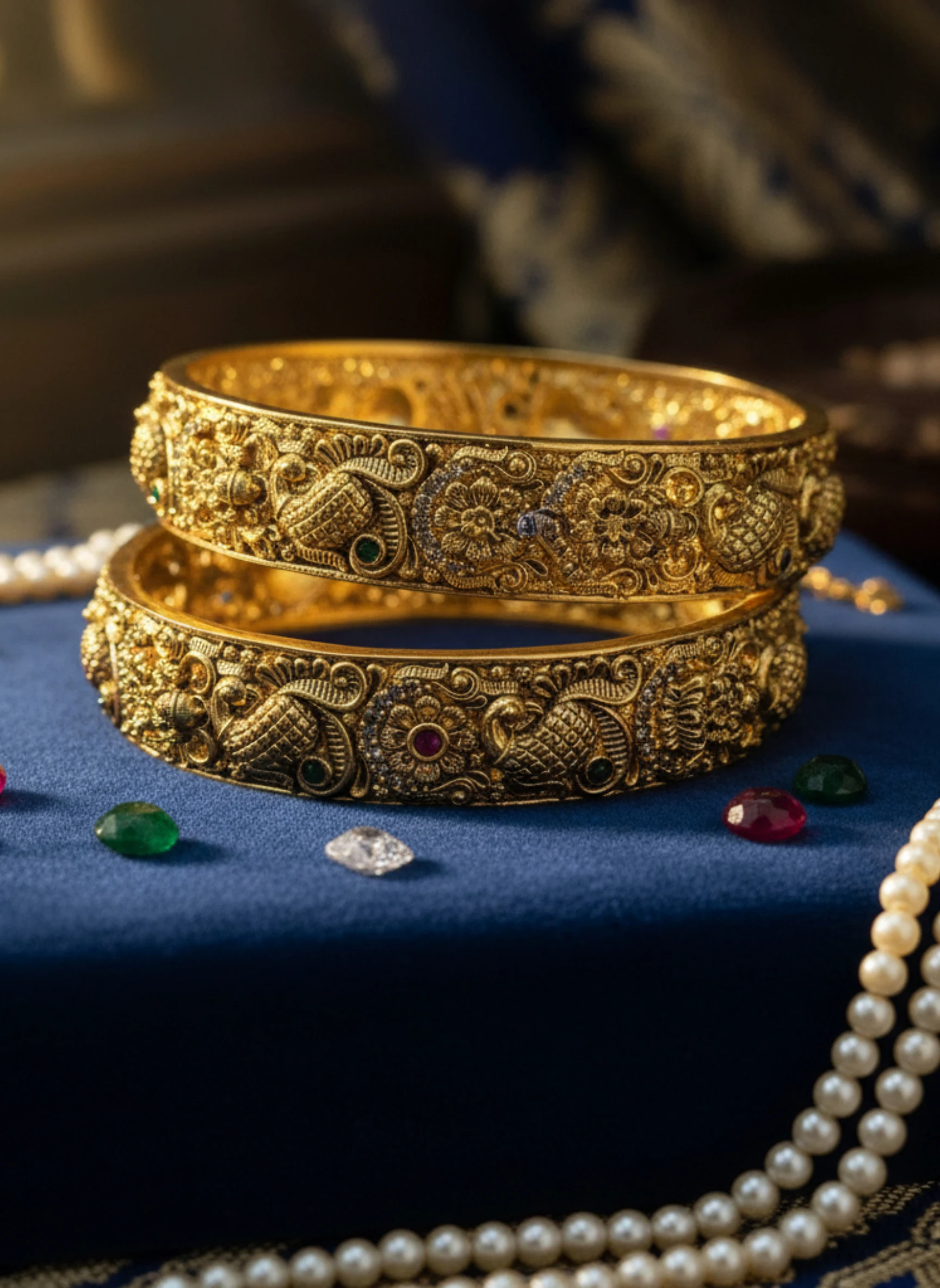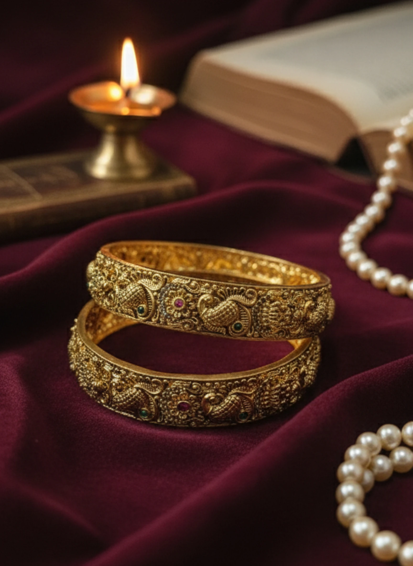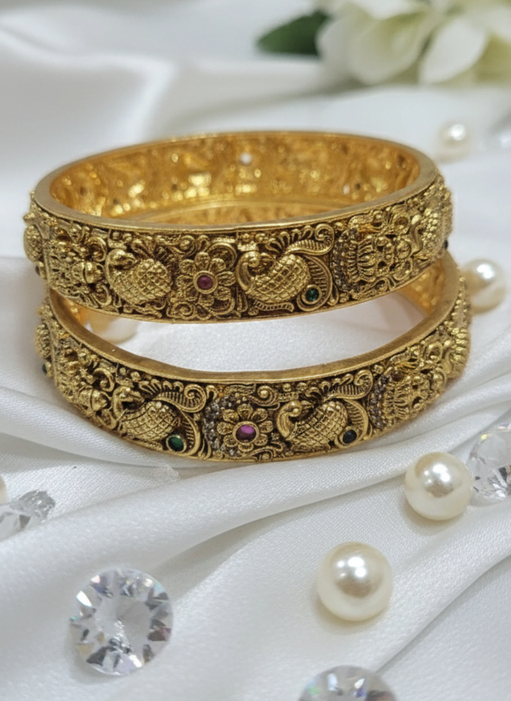 Inspired by temple art, each bangle features Goddess Lakshmi seated on a lotus, framed by peacock and floral motifs. The ruby and emerald stones alternate beautifully, enhancing the antique gold base. Every carving reflects traditional nakshi depth and sculptural detailing—turning these bangles into miniature pieces of temple architecture.