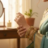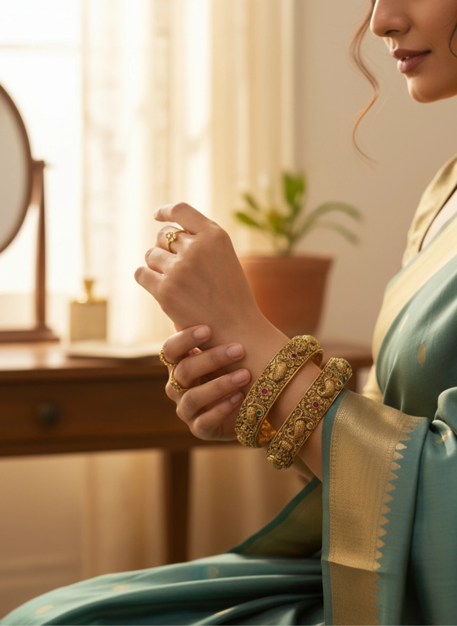 The ruby and emerald stones represent prosperity and divine energy, enhanced by CZ highlights that add a soft sparkle. Finished with an oxidized antique gold patina, these bangles carry an heirloom appeal that reflects India’s sacred artistry.