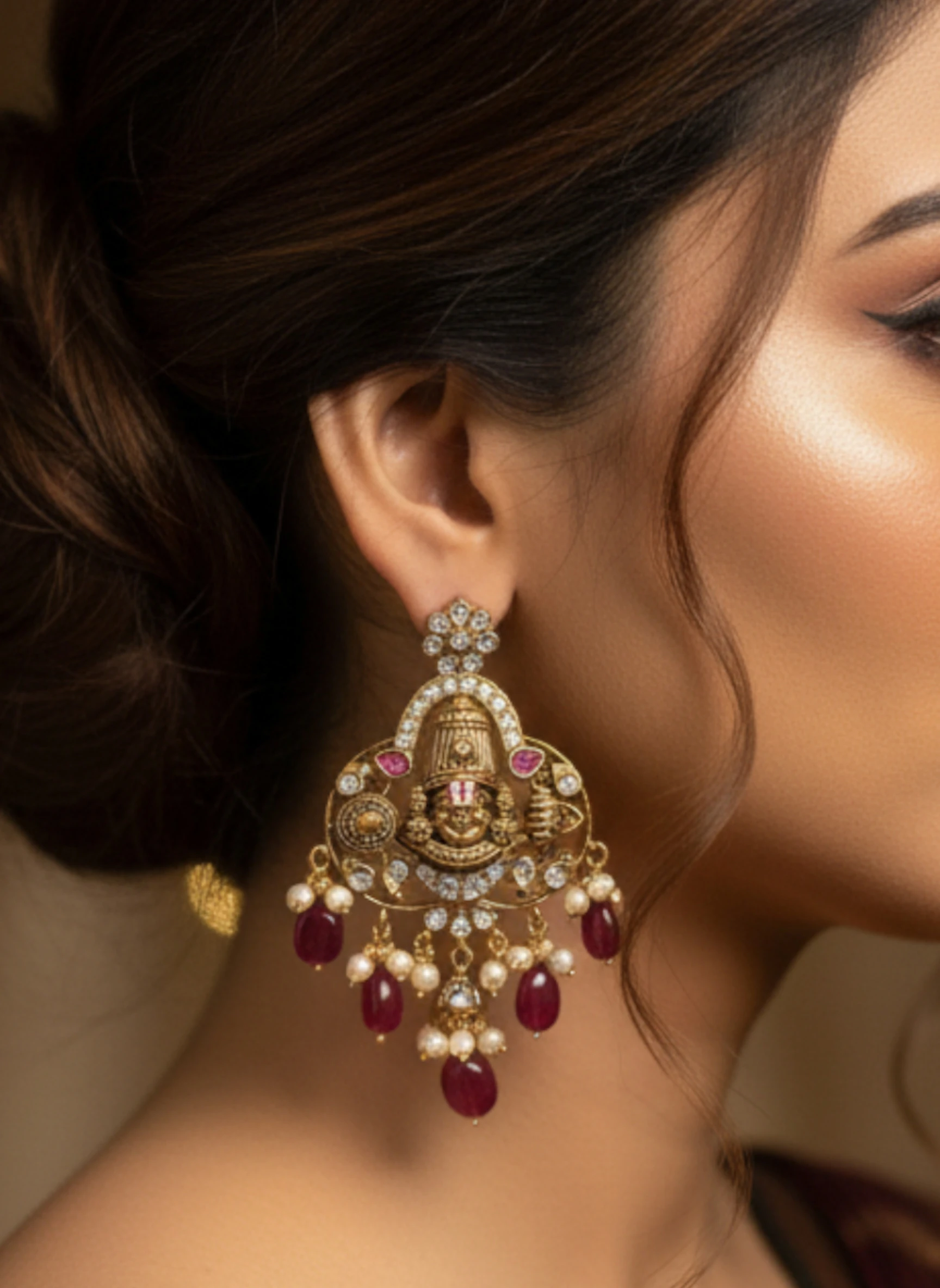 • Matching Chandbali Earrings: Coordinated earrings featuring Balaji motif, crescent shape, and pearl drops.