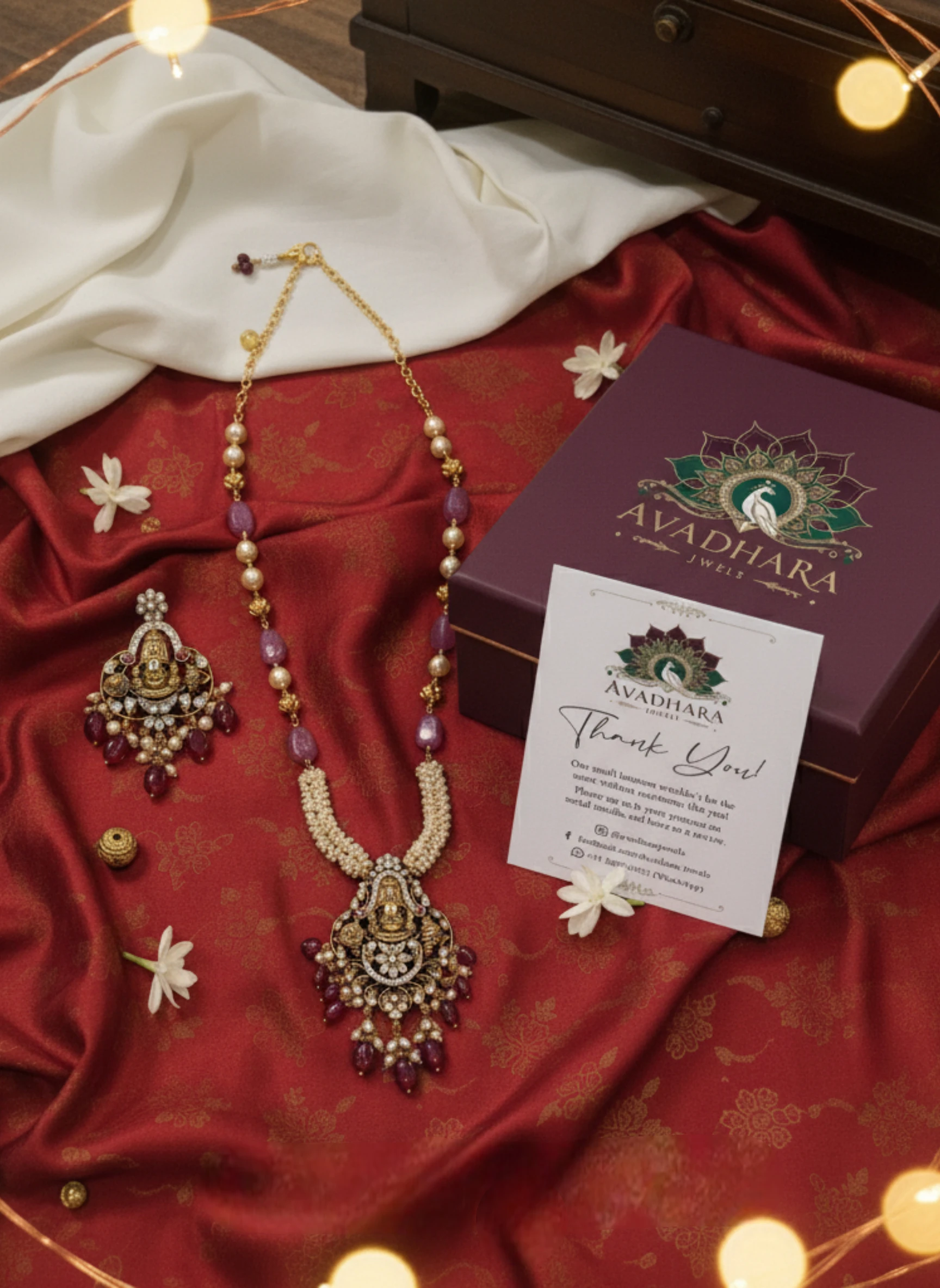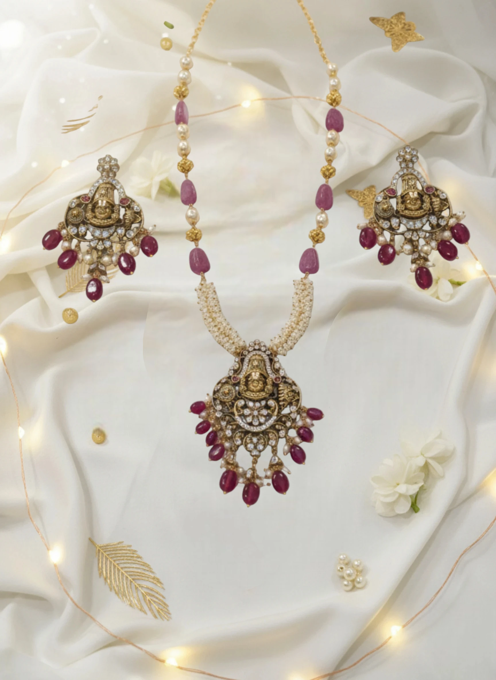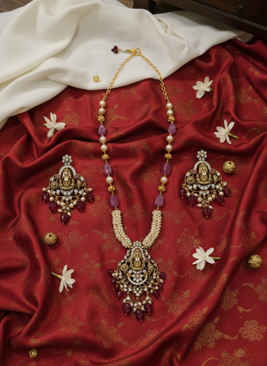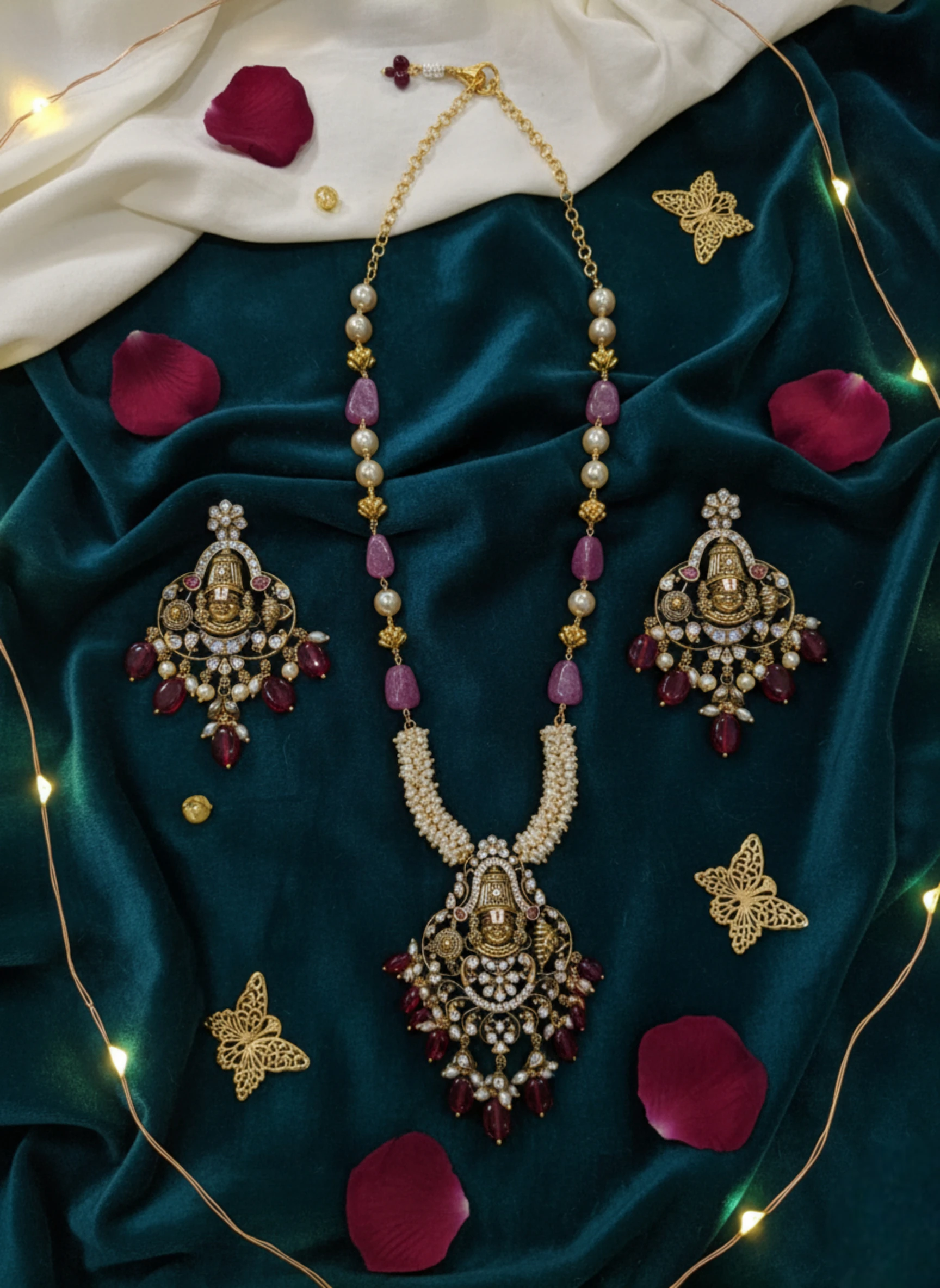 Complete temple jewellery set featuring divine Tirupati Balaji pendant in stunning dual-tone finish. Long pearl haram adorned with ruby pink gemstone beads and matching chandbali earrings. Perfect devotional jewellery for temple visits, festivals, and traditional celebrations. Antique gold and oxidized silver combination.