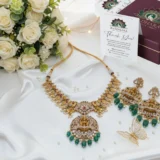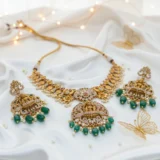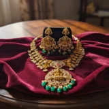 Be the first to review “Divine Lakshmi Temple Necklace Set – Antique Gold Bridal Jewelry with Emerald & Ruby Stones”
