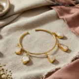 The Druzy Charm Cuff (Swarna meaning ‘Golden’) is a celebration of organic beauty and contemporary design. Moving beyond traditional Indian bangles, this modern cuff bracelet offers a sleek, minimal open band in a luxurious gold tone. The true highlight lies in the five asymmetrical, raw-cut stone charms (resembling natural druzy or raw quartz) that gracefully dangle around the bracelet. Each stone is unique, encased in a finely crafted gold-plated bezel, adding an authentic, bohemian charm to the piece.