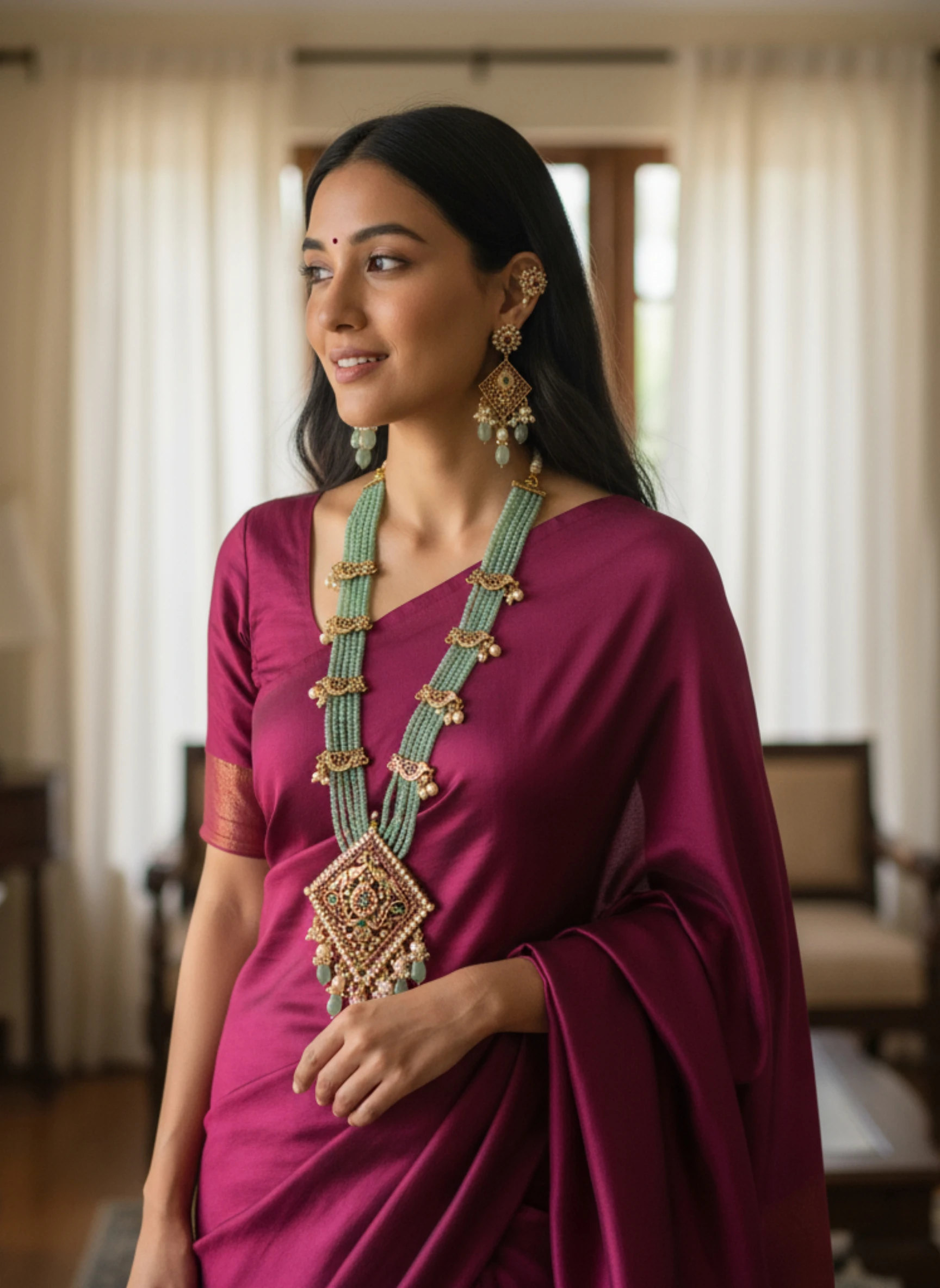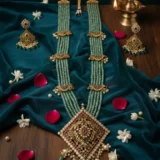 A regal temple-style long haram featuring strands of soothing green emerald beads, embellished with antique gold motifs and a grand Lakshmi pendant. Perfect for weddings, festive occasions, and traditional celebrations.