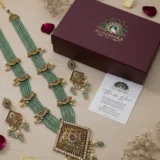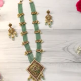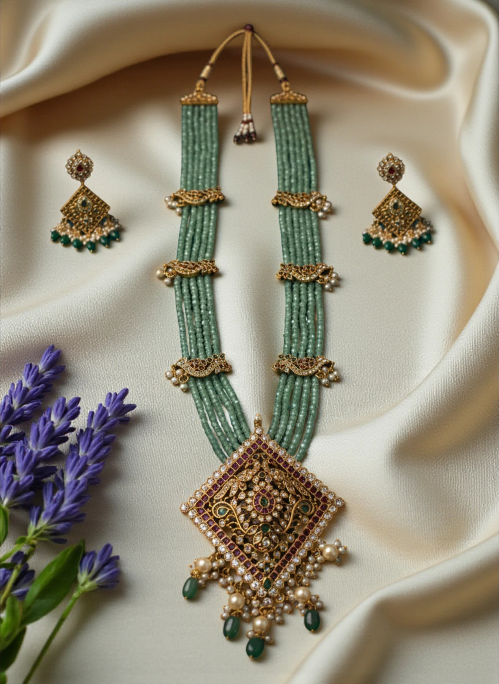 Each strand of soft green beads is gracefully intertwined with antique gold elements, leading to a majestic square pendant adorned with kemp stones, pearls, and emerald drops. The matching temple-style jhumkas complete the ensemble with timeless grandeur.