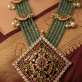 Rooted in South Indian temple heritage, this long haram celebrates divine elegance through goddess-inspired motifs, antique gold craftsmanship, and soothing emerald bead strands. - Pendant Design: