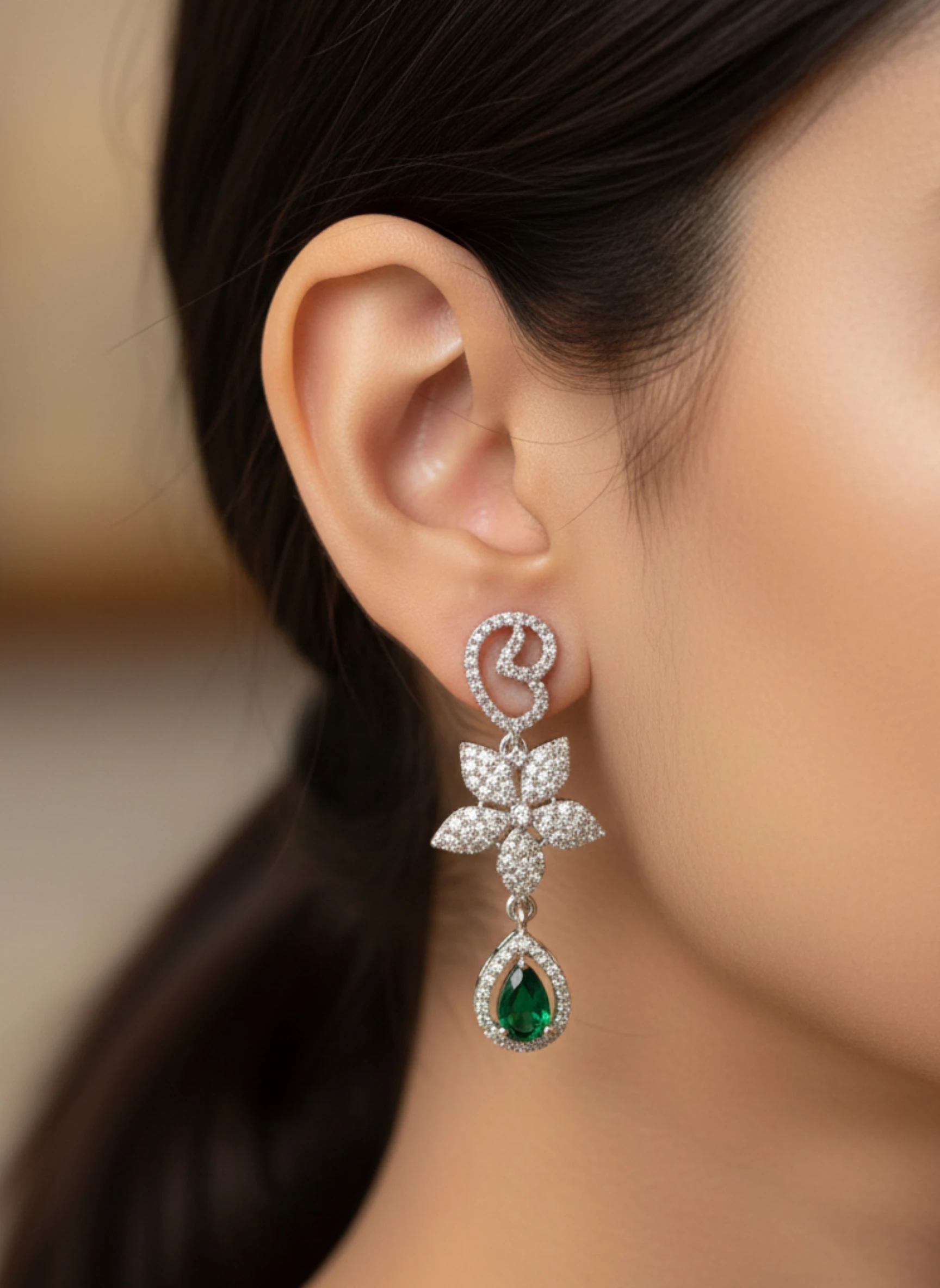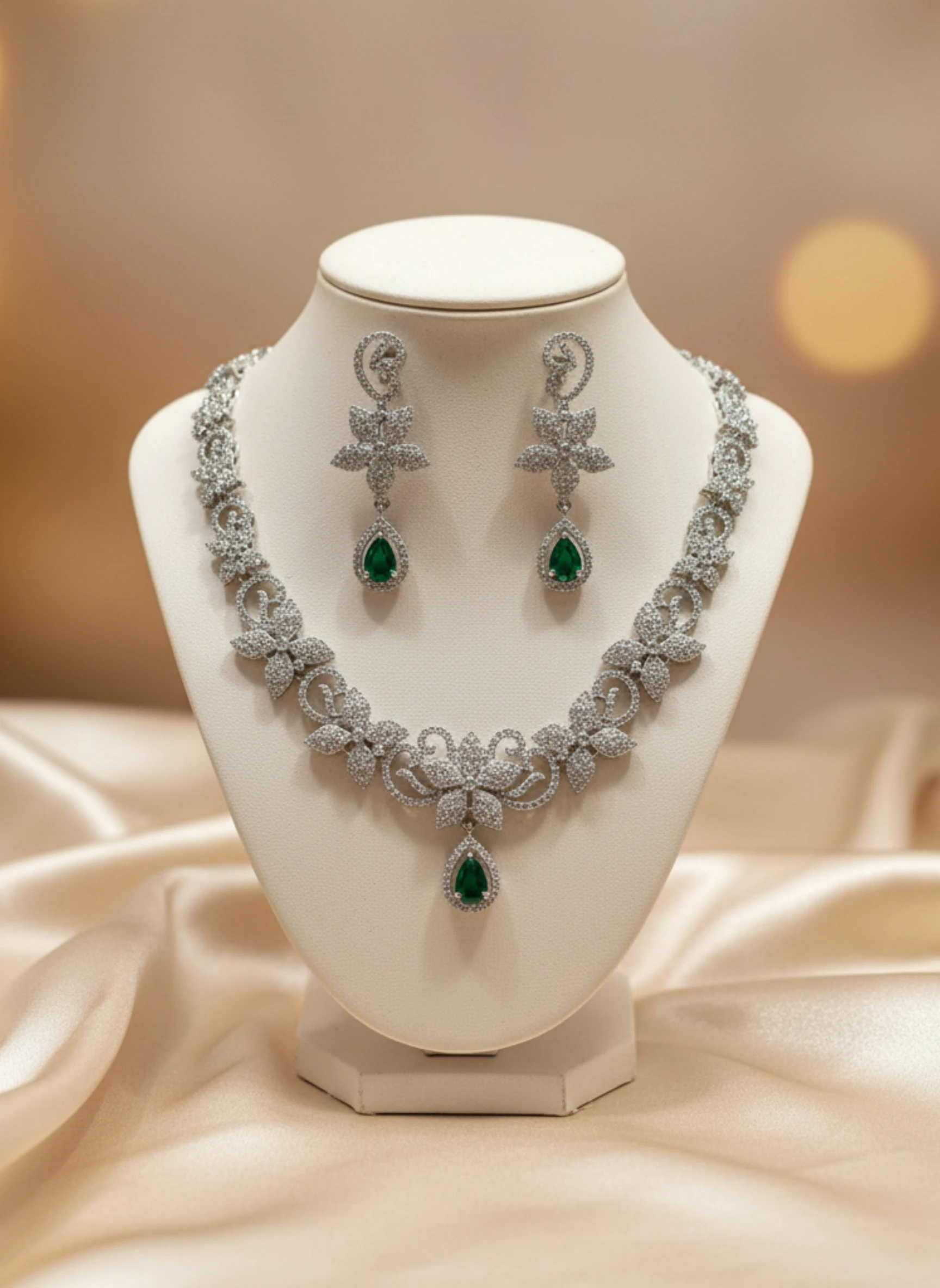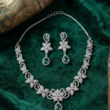 The necklace’s design is an enchanting cascade of interconnected floral clusters. Each flower is meticulously outlined and filled with an array of pave-set American Diamonds, creating an intricate mesh of sparkle. The individual floral units are linked, forming a graceful curve that sits perfectly as a choker. From the prominent central floral element and several strategically placed points along the necklace, delicate emerald green (simulated) teardrop stones dangle, offering subtle movement and a luxurious splash of color. The matching earrings are a scaled-down yet equally intricate version of the necklace’s floral motif, with a central green drop that harmonizes the entire set. The use of high-quality rhodium plating ensures a bright, enduring silver finish that makes the white AD stones pop and adds to the overall premium feel of the piece. The craftsmanship reflects attention to detail, making it a standout accessory.