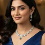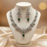 Fashioned with a premium rhodium-plated finish, this set offers a sophisticated silver-tone lustre that beautifully complements the sparkle of the AD stones and the depth of the green accents. It’s perfect for those who seek the luxurious appeal of fine jewellery but prefer a lighter, more contemporary aesthetic. Whether it’s a mehndi function, a festive puja, a grand wedding reception, or an elegant evening party, this set promises to make you feel radiant and effortlessly stylish. It’s more than just an accessory; it’s a celebration of your unique style and grace, delivering premium look and feel that’s truly bemisaal (unparalleled)!