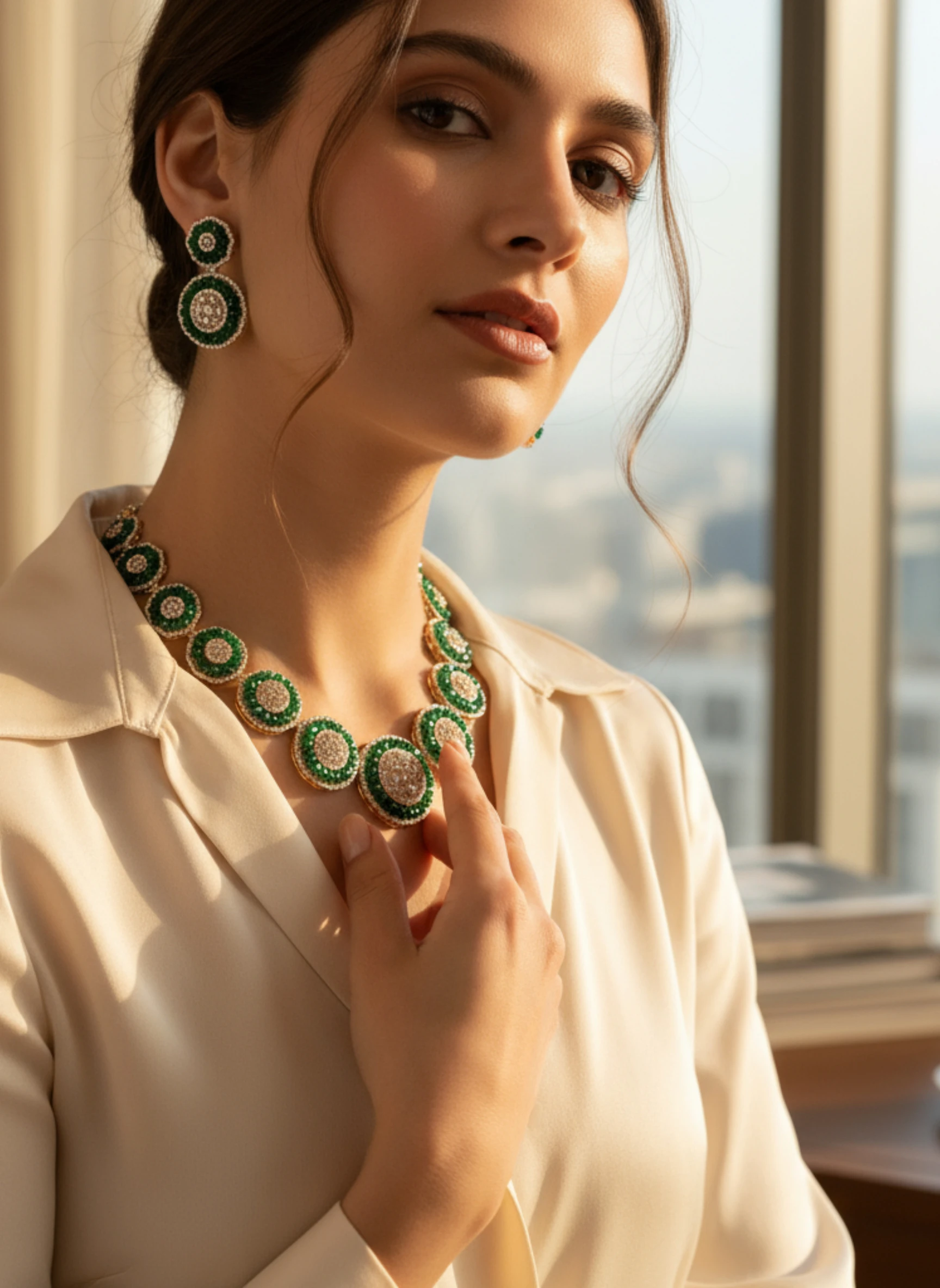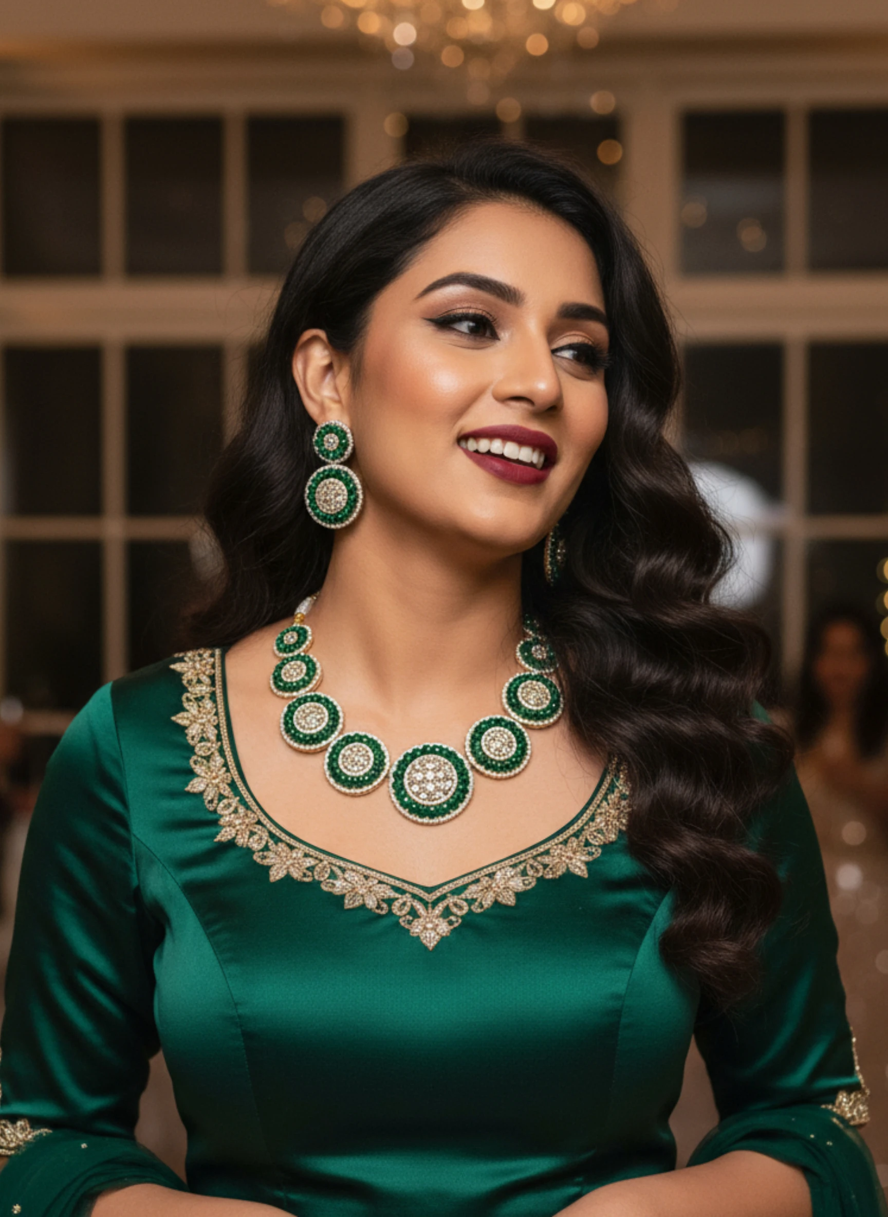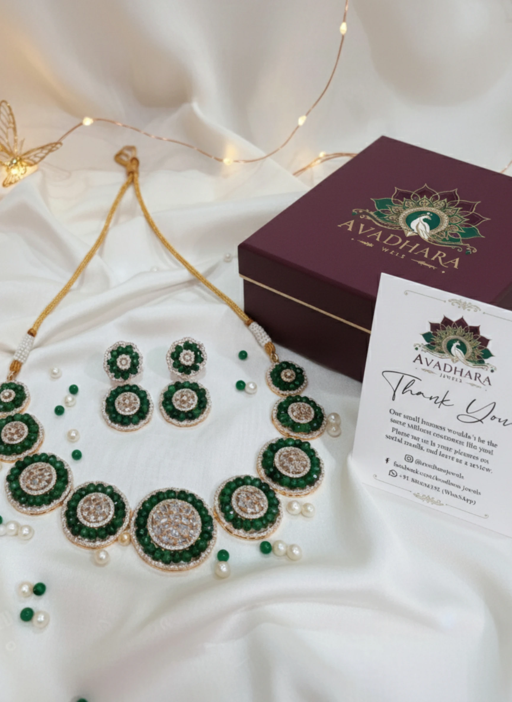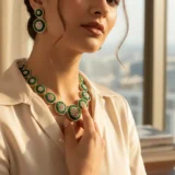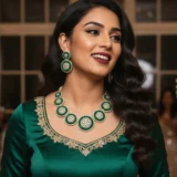 This masterpiece features concentric circular designs that merge crystal brilliance with deep green beads, forming a luxurious halo effect. Each piece reflects precision craftsmanship and elegant detailing, making it an ideal choice for women who appreciate regal aesthetics with modern appeal.