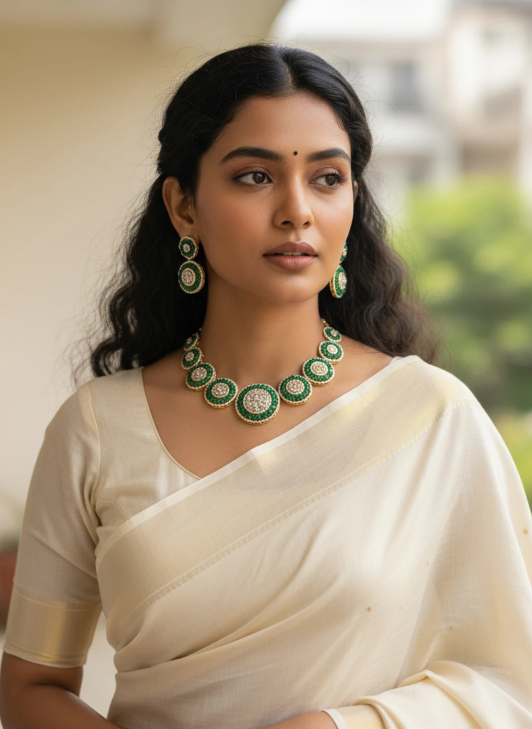 Pair this Emerald CZ Necklace Set with a traditional silk saree or an Indo-western gown to create an eye-catching festive look. Add soft curls and a bold lip color to complete the statement ensemble.