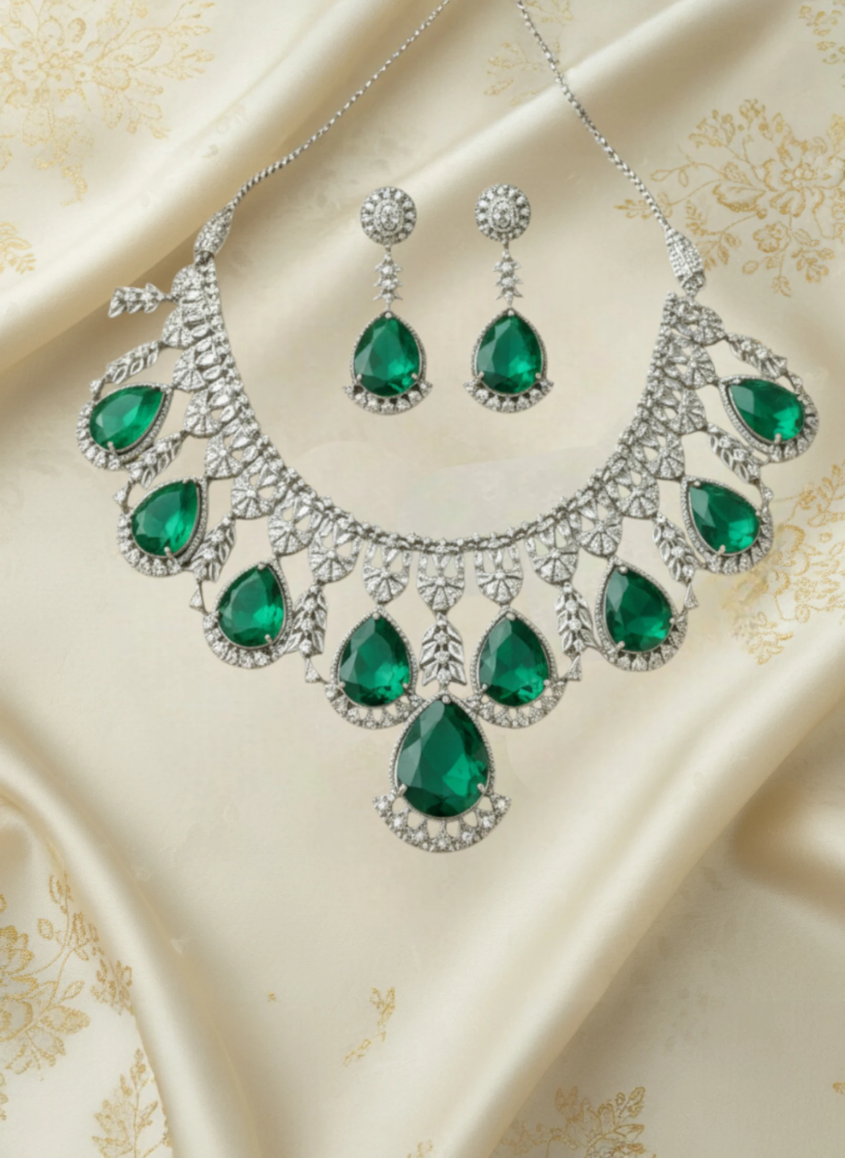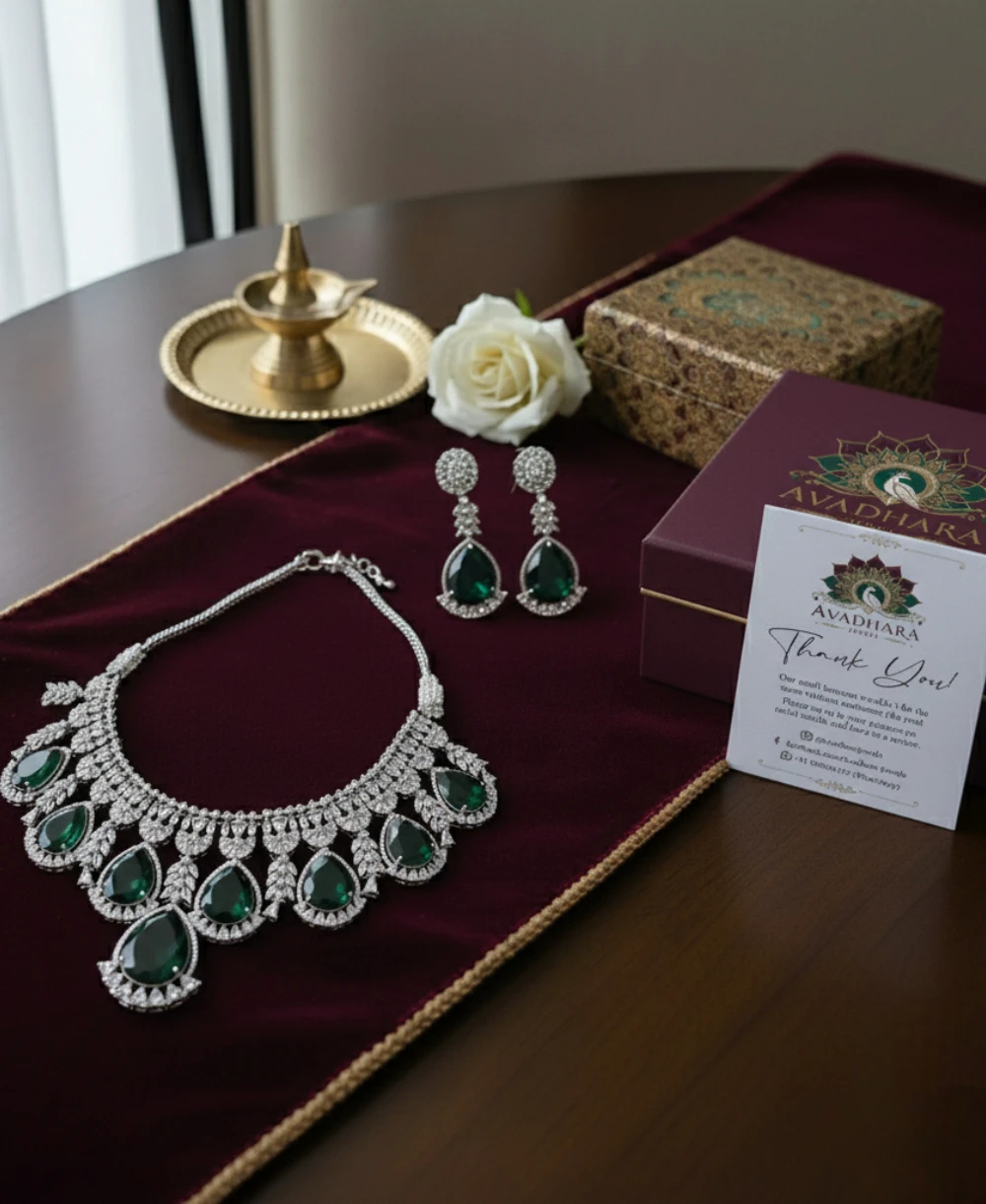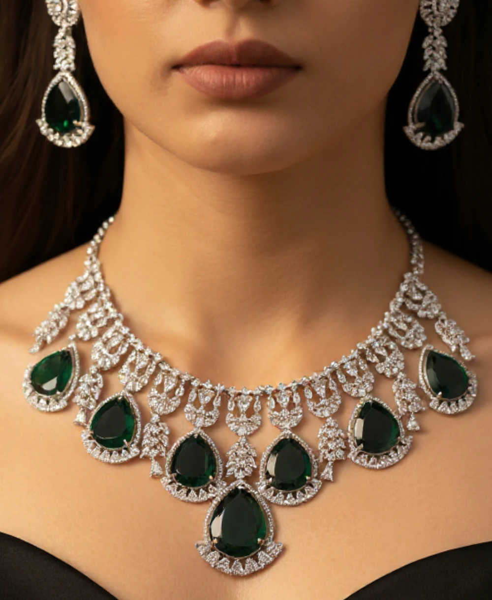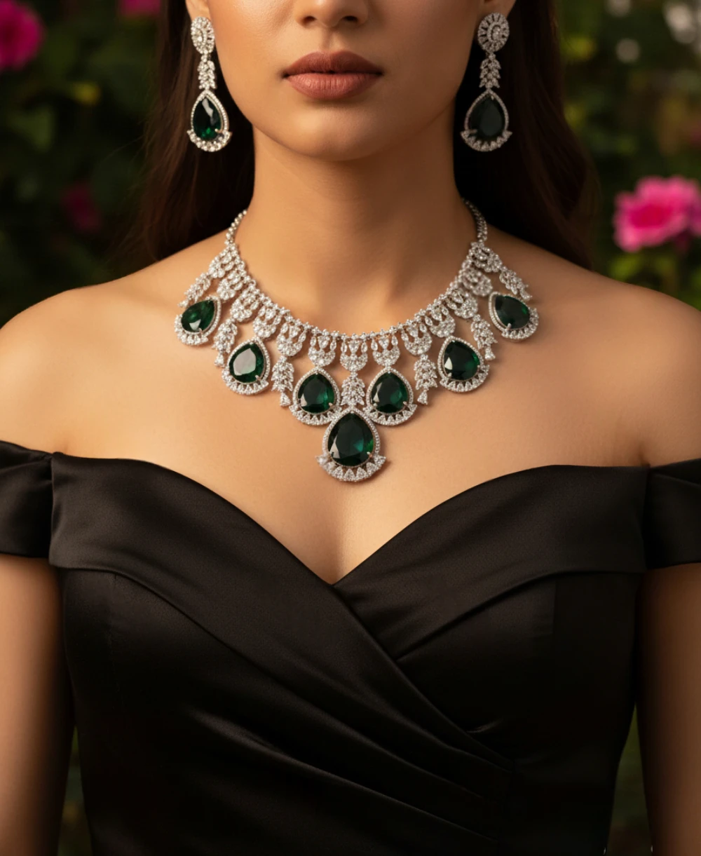 Enjoy the brilliance of emeralds and diamonds without the high cost. Crafted with premium imitation stones that mirror genuine gems in sparkle and clarity — ideal for special occasions where you want maximum glamour without the worry of fine jewelry. - Complete Coordination: