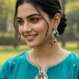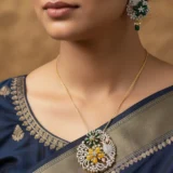 - Traditional Look: Pair this pendant set with silk sarees in maroon, royal blue, or cream — the green stones will stand out beautifully.