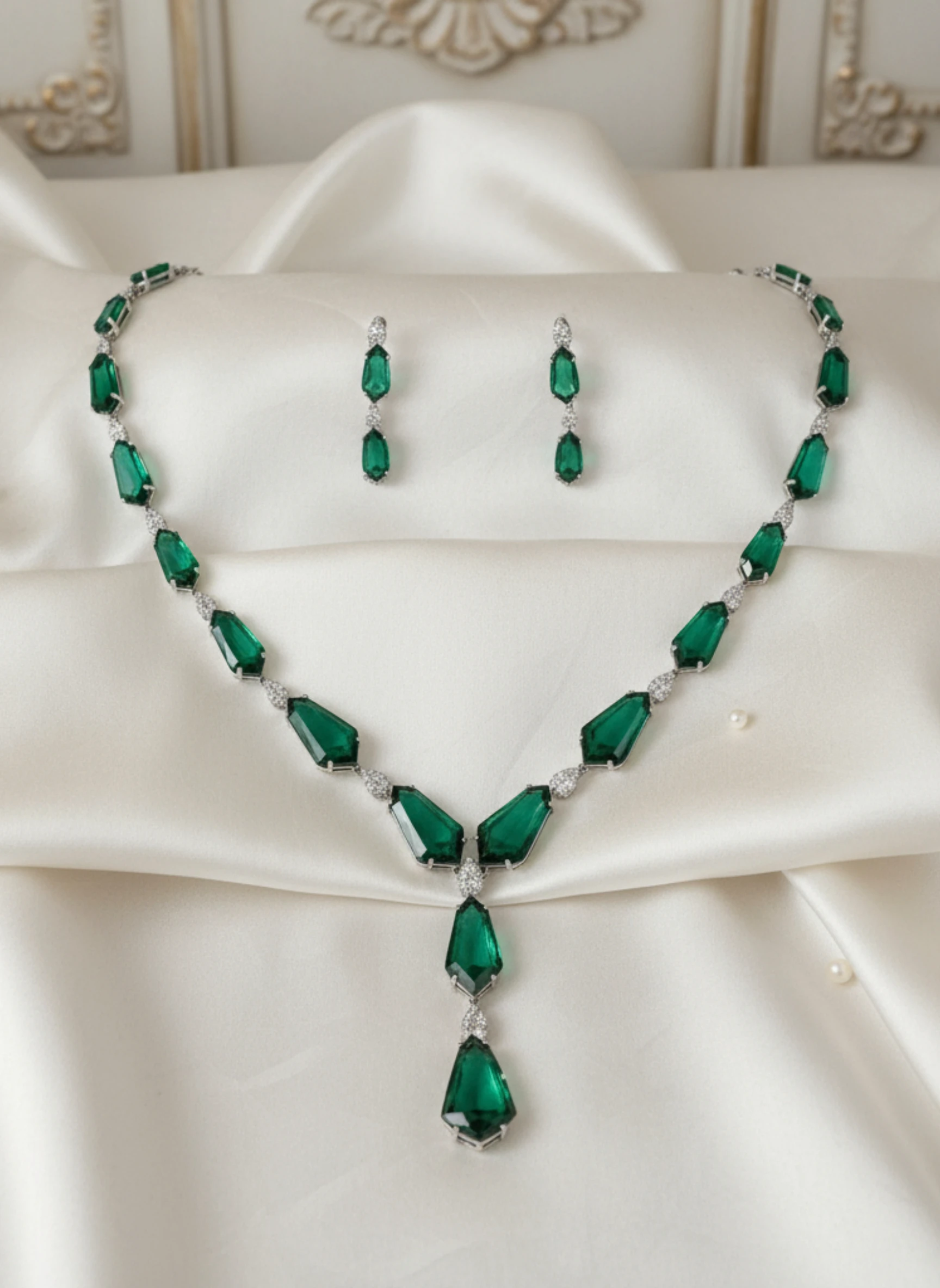 - Vibrant emerald green faceted crystal stones in geometric cuts