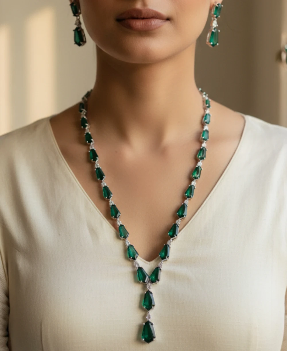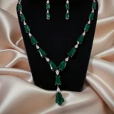Turn every head with this stunning Emerald Green Stone Necklace Set. Crafted with precision and elegance, this statement piece features geometric green stones in a sleek silver-tone setting, paired with matching drop earrings — perfect for weddings, festive occasions, or evening parties.