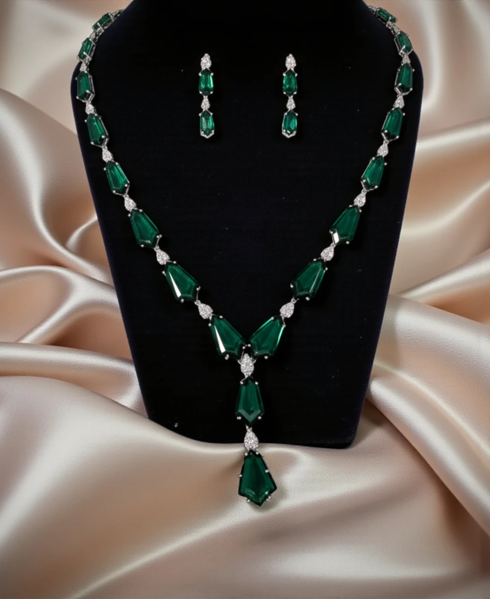 Make a breathtaking entrance with this exquisite emerald green crystal necklace set that epitomizes luxury and sophistication. This stunning jewelry ensemble features a dramatic long necklace adorned with faceted emerald-green crystals and sparkling clear stones, complemented by perfectly coordinated drop earrings. The rich green hue combined with brilliant silver-tone accents creates a regal aesthetic that’s perfect for making unforgettable style statements.