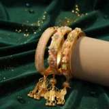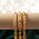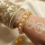 Step into timeless Indian elegance with this gold-tone kada bracelet. The wide cuff features ornate filigree and a harmonious arrangement of pastel glass beads in soft pink, mint green, and pale yellow. The bracelet closes securely with a hinge/clasp for easy wear, and the inner circumference is crafted for comfortable all-day wear. This versatile piece pairs beautifully with sarees, lehengas, or anarkalis for weddings, festivals, and festive gatherings, adding a regal touch and graceful movement to your wrist.
