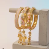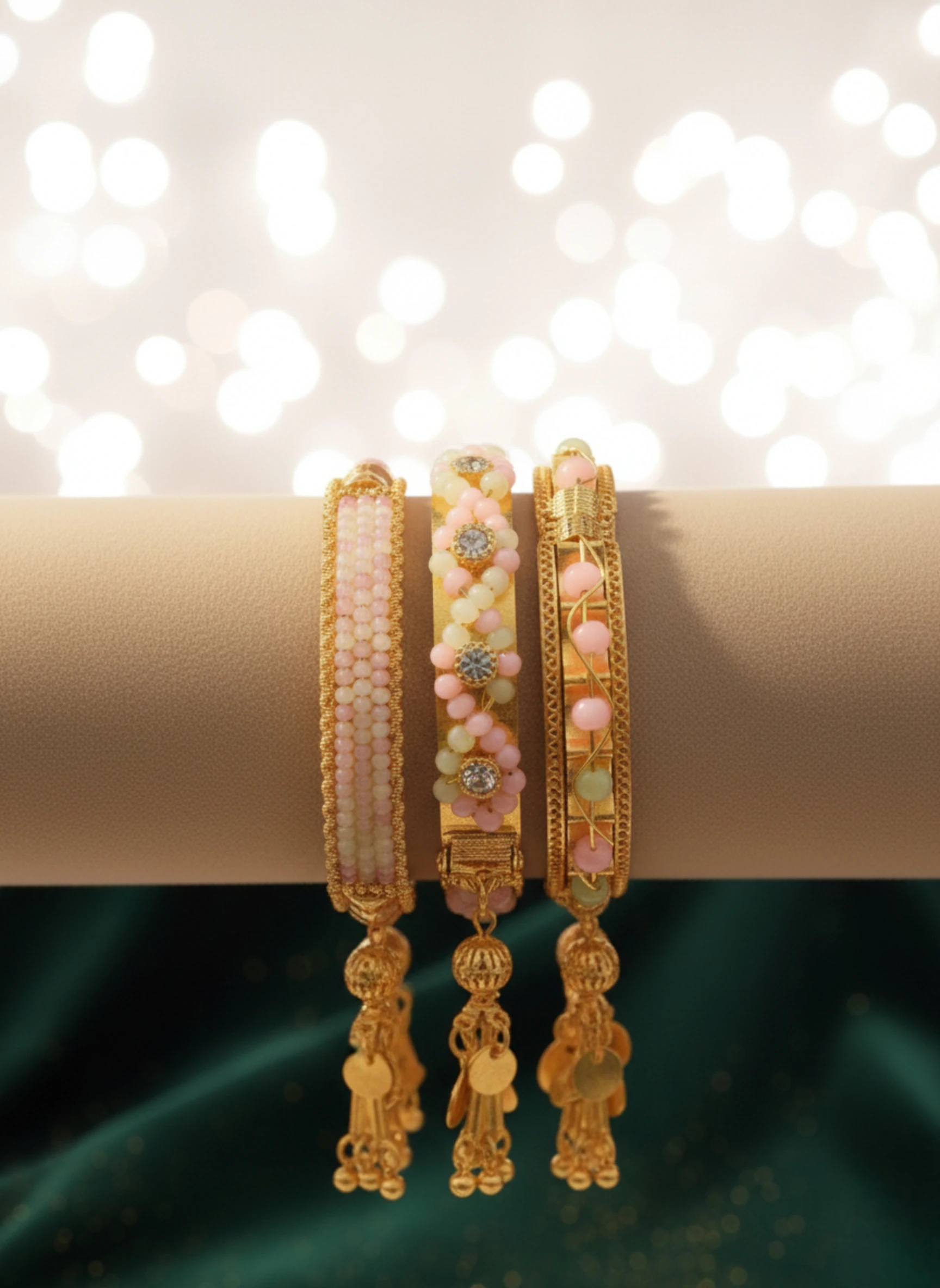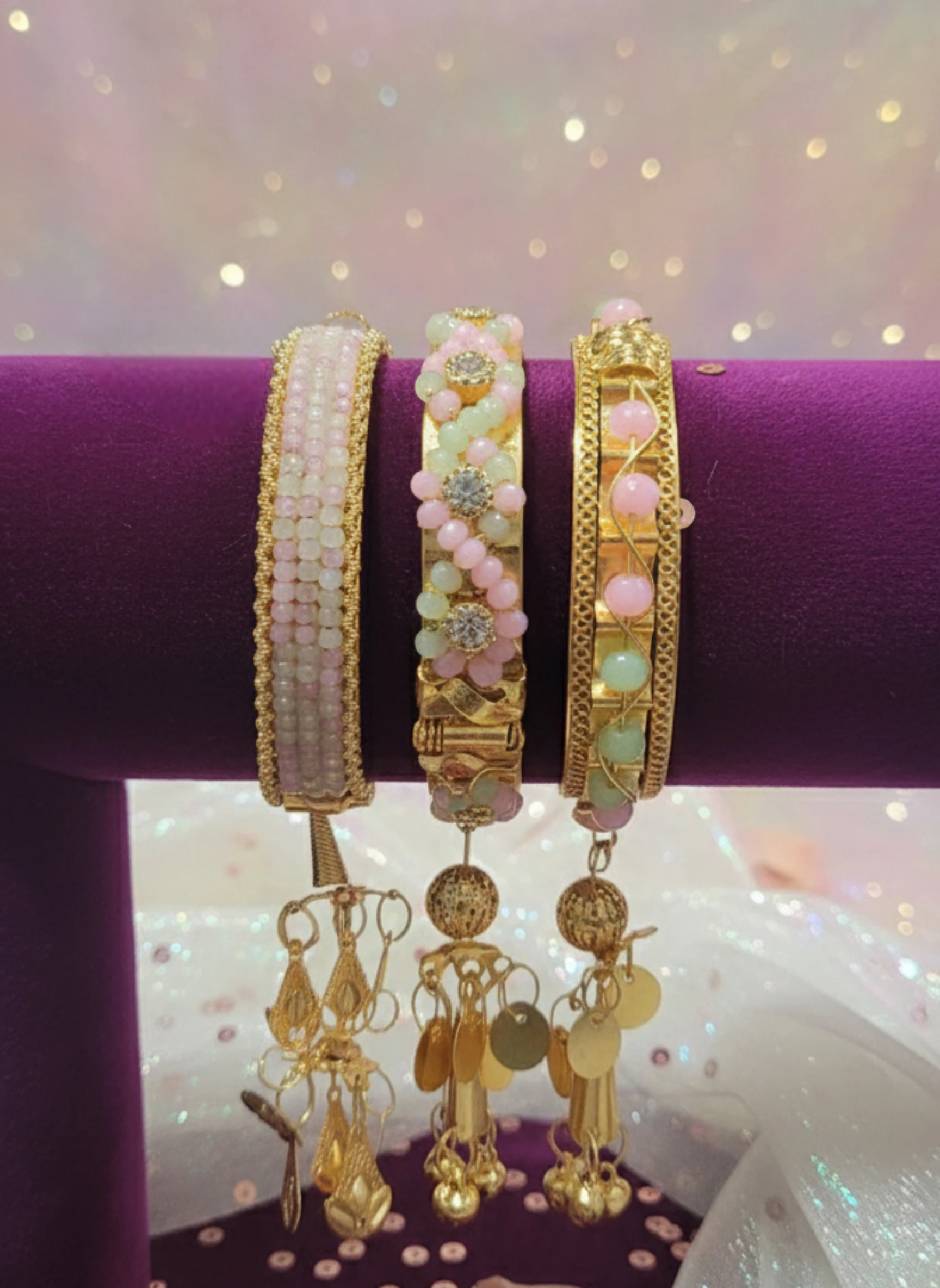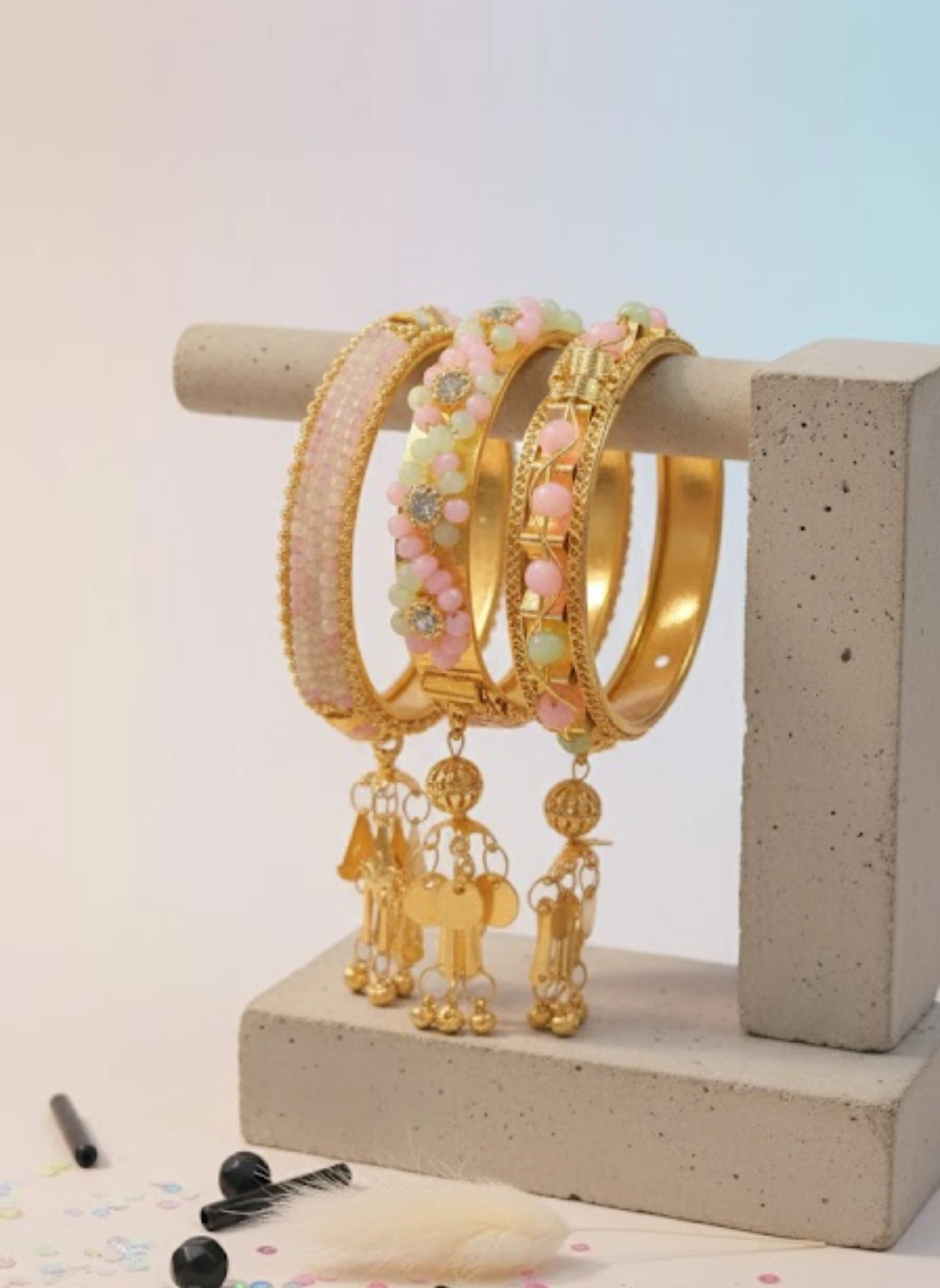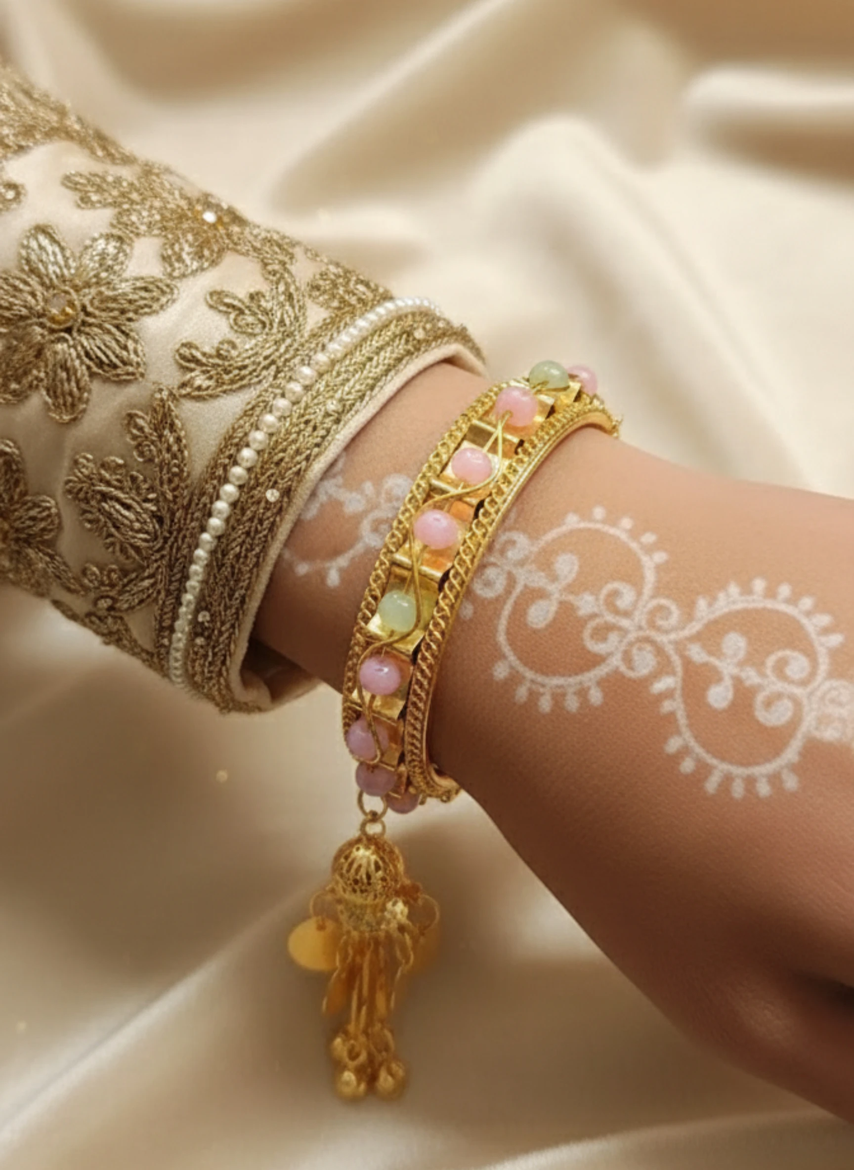 Elegant gold-tone kada bracelet with alternating pastel glass beads and ornate filigree work. Secure clasp and comfortable fit, designed to complement traditional and contemporary ethnic outfits.
