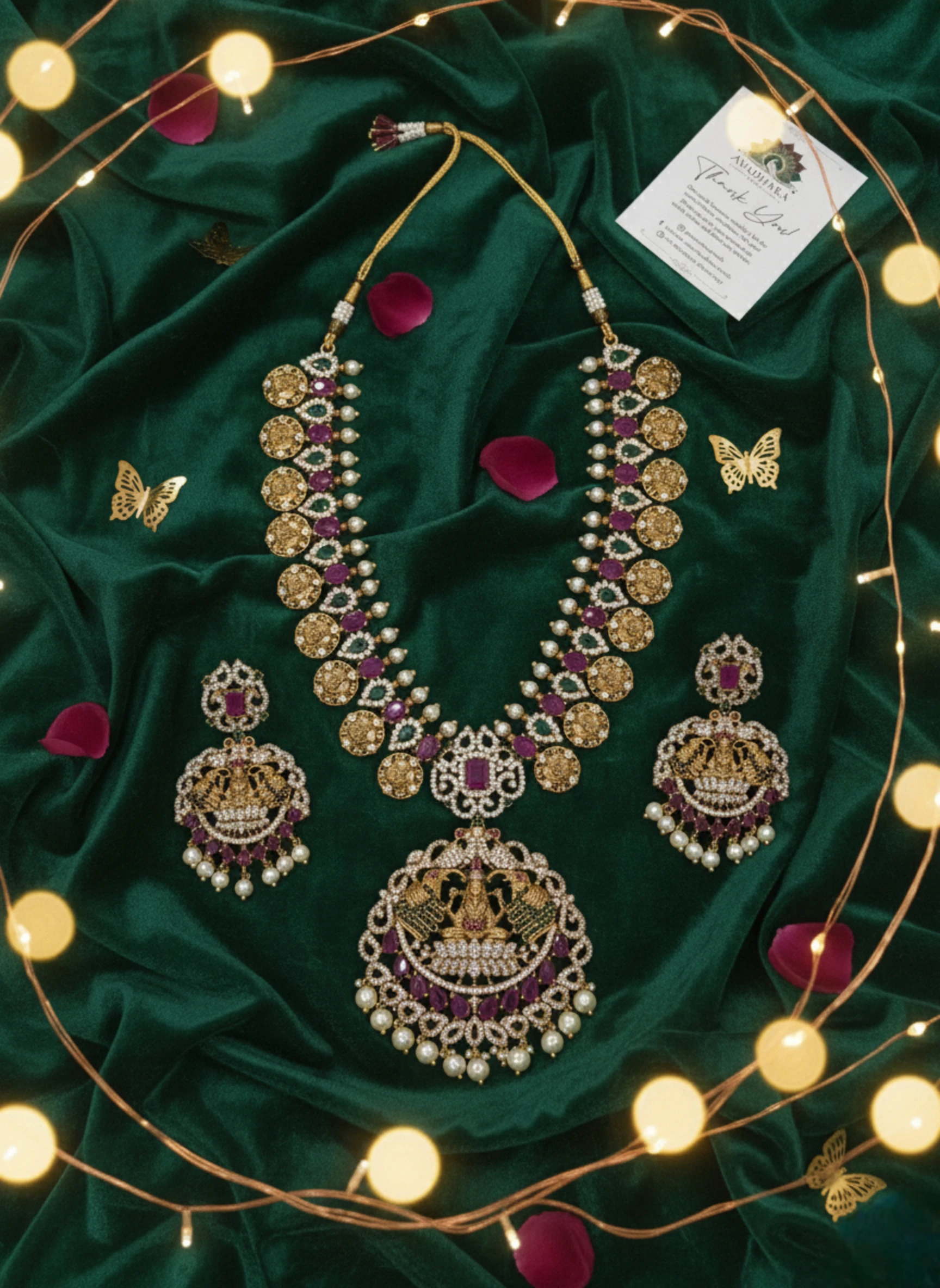 | Design motifs | Traditional temple goddess centerpiece with ornate filigree |