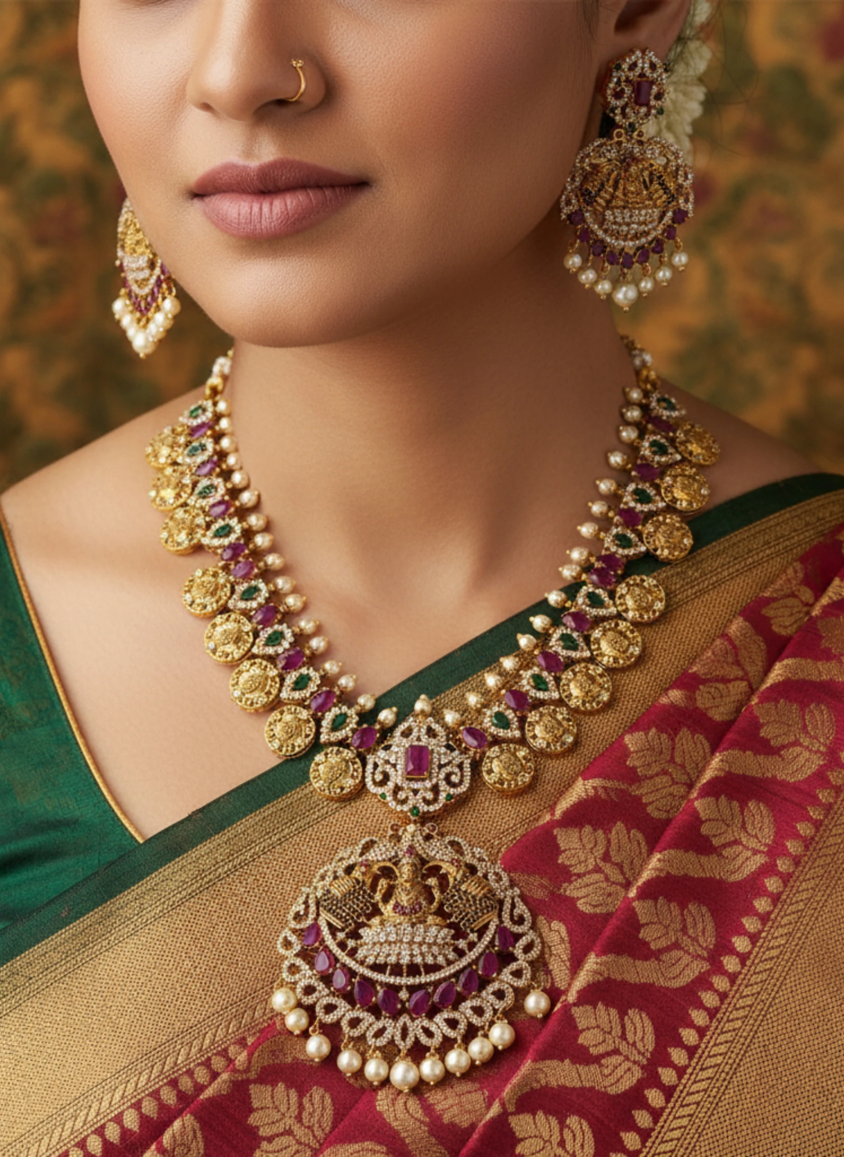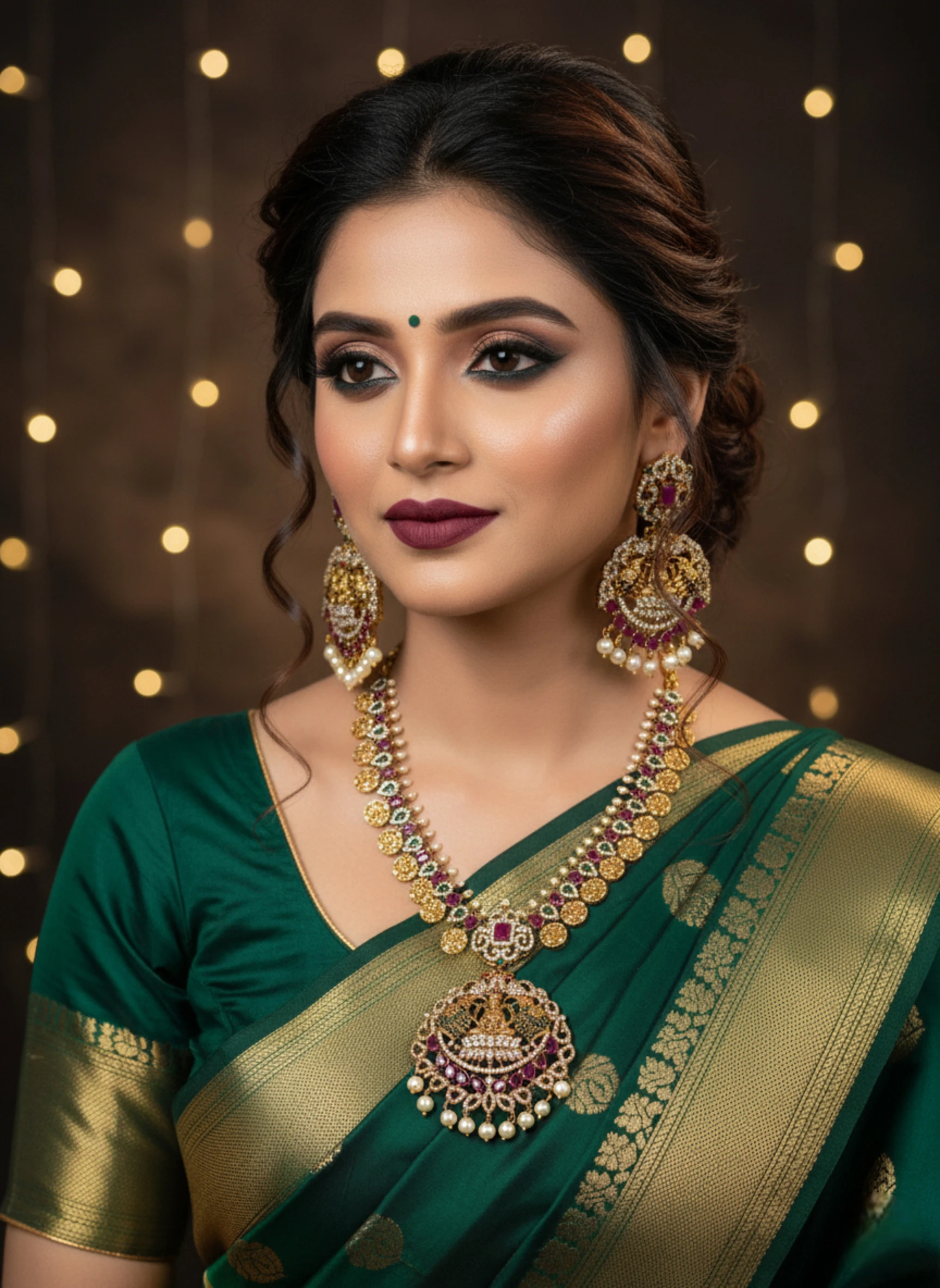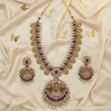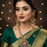 Pair with a gold or emerald-toned saree or a green/pearl lehenga. Tie your hair in a neat bun or a traditional braid to showcase the centerpiece. Add a matching maang tikka and a simple set of bangles to balance the opulence. Keep makeup warm-toned with golds and bronzes to highlight the jewelry’s glow.