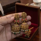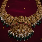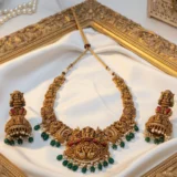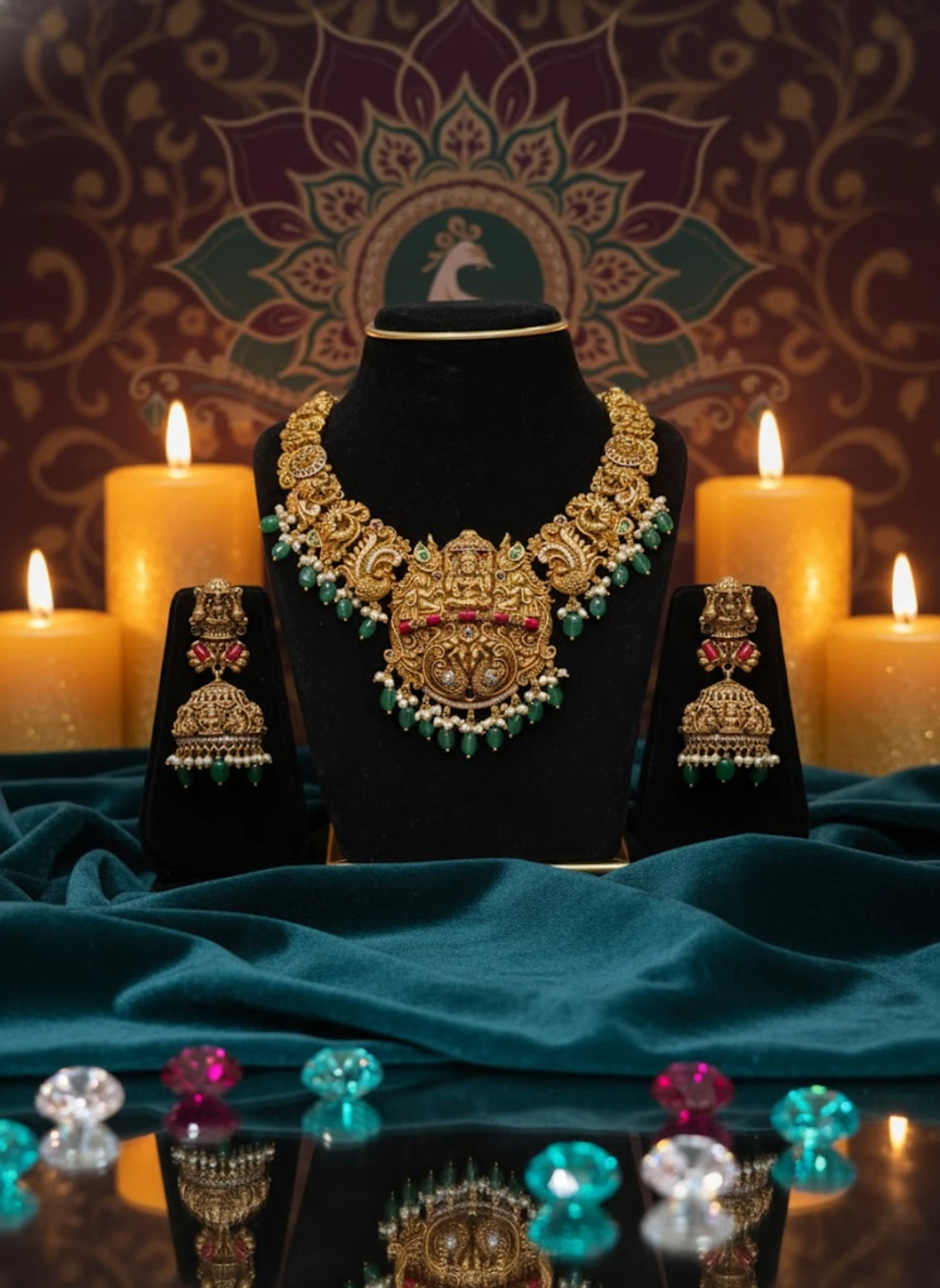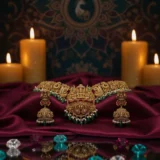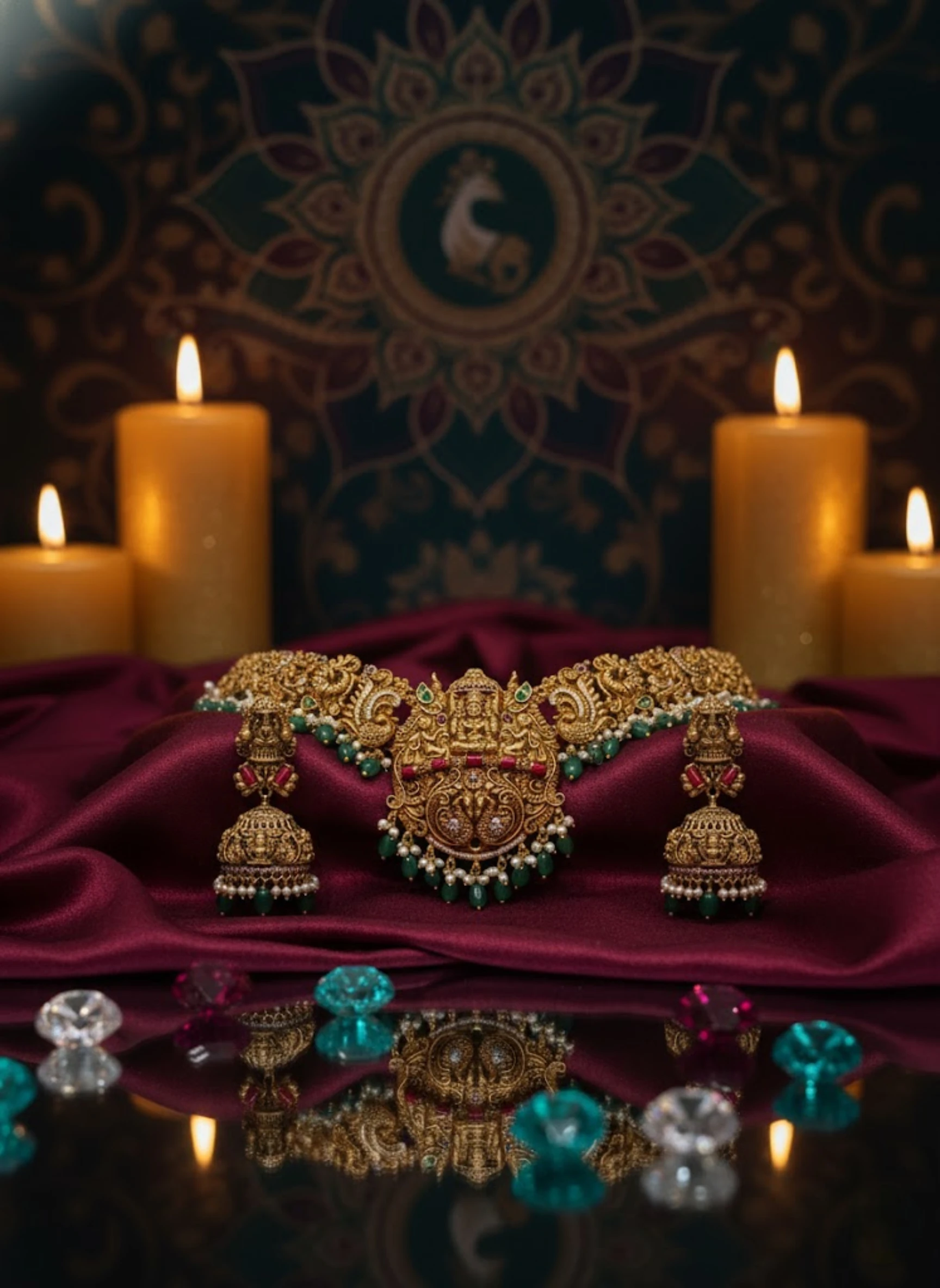 • Rich, heavy-design choker with intricate temple/jhumka-inspired motifs