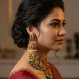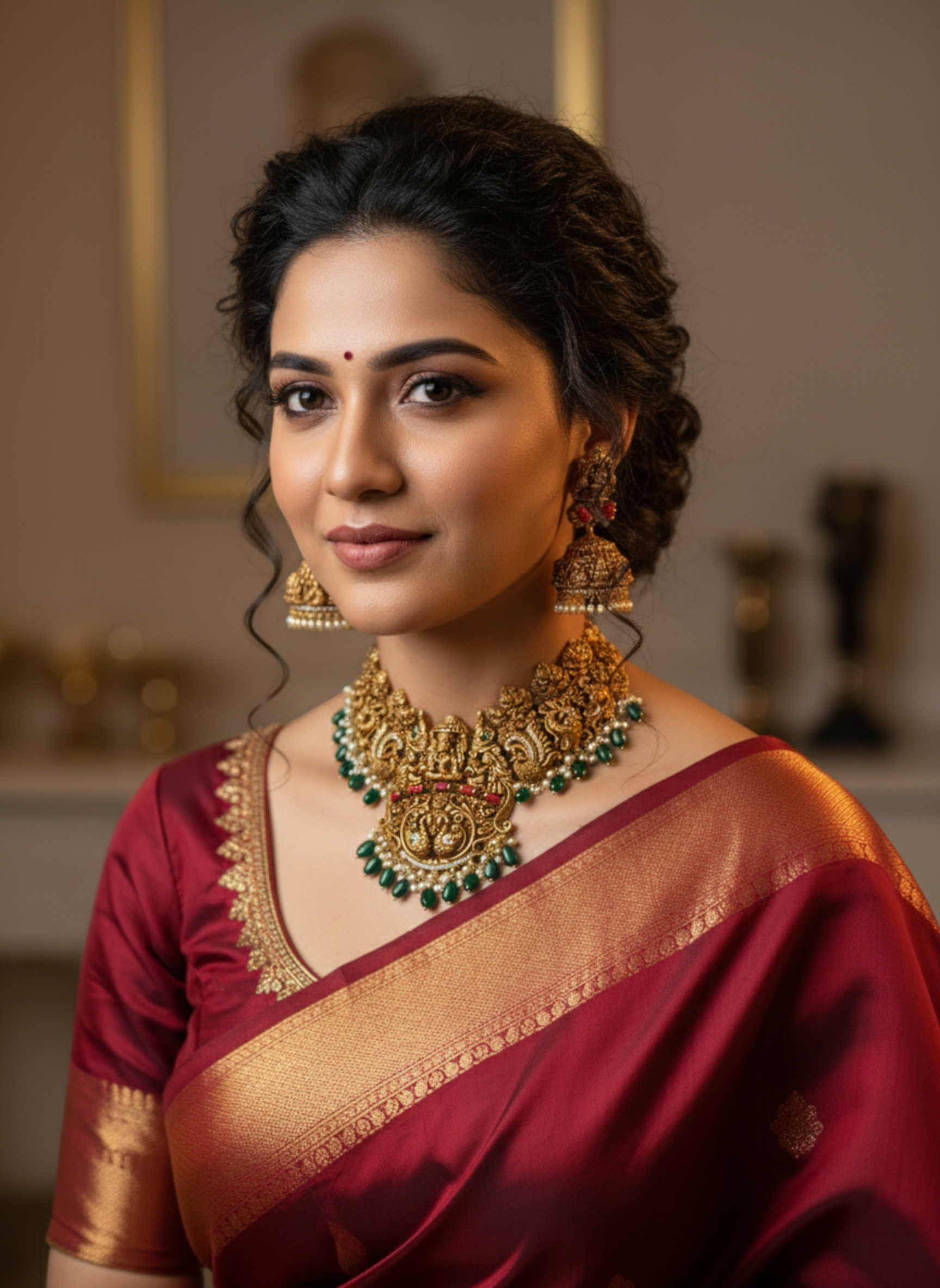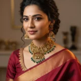 Pair with a richly colored silk saree (emerald green, ruby red, or royal blue) to make the multicolored gems pop. Keep other jewelry minimal—perhaps a delicate bangles stack or a solitaire ring—so the choker remains the focal point. For makeup, go with warm gold tones and a bold lipstick to complement the gold plating.