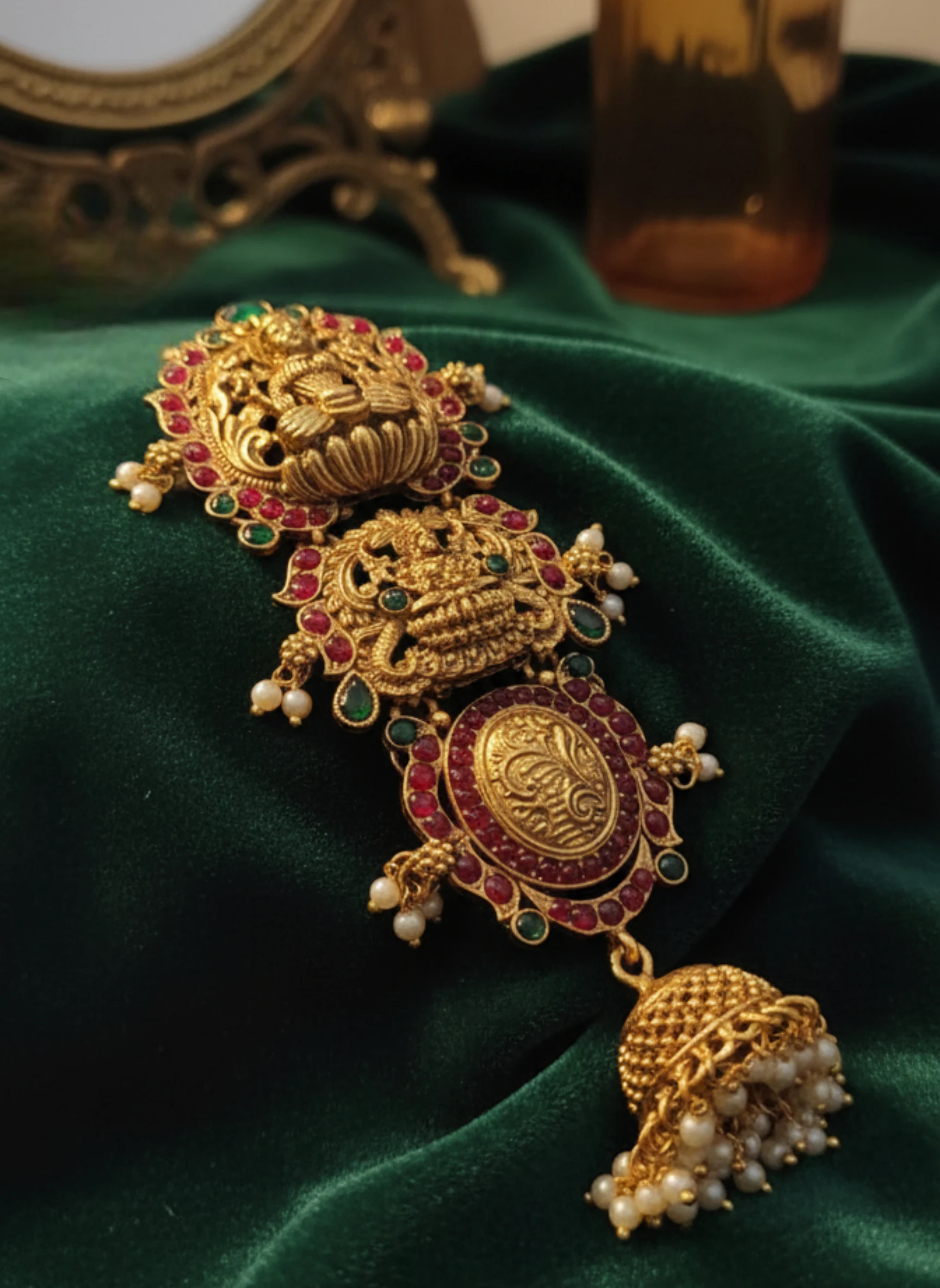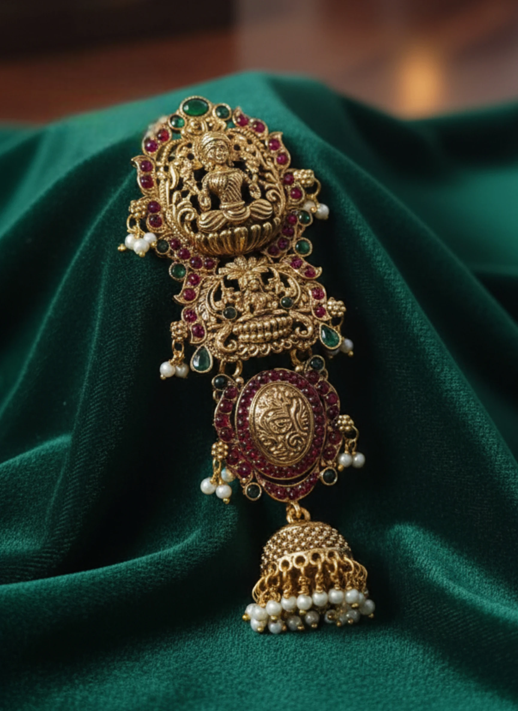 Indulge in timeless Indian elegance with the Jada Pillai hair accessory. This opulent piece draws inspiration from sacred temple jewelry, featuring a central deity motif framed by ornate gold-toned filigree. Surrounding the motif are a lush array of jewel-toned stones in emerald green and ruby red, accented with delicate pearl drops and green enamel accents. The design flows into a cascading jhumka-like pendant that ends with a dangling beadwork fringe, creating movement and a regal silhouette when worn with a saree or lehenga.