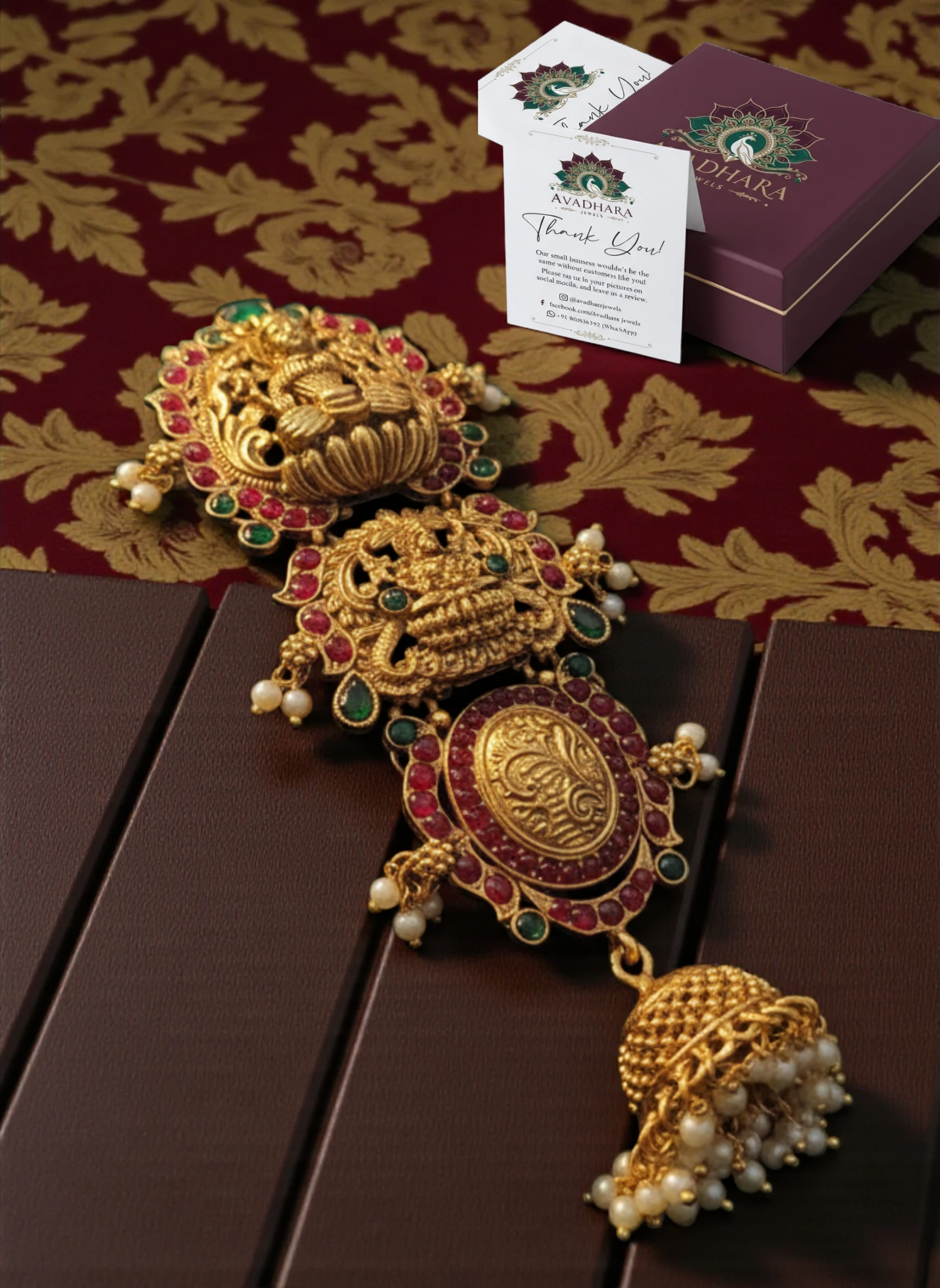 For maximum impact, pair with a gold-toned saree or red/green lehenga. Create a smooth bun or a structured braid to anchor the piece securely. Add a matching set of small gold jhumkas or a delicate necklace to balance the heavy centerpiece, and consider a soft makeup palette with warm gold and cream shades to highlight the jewelry’s shine.