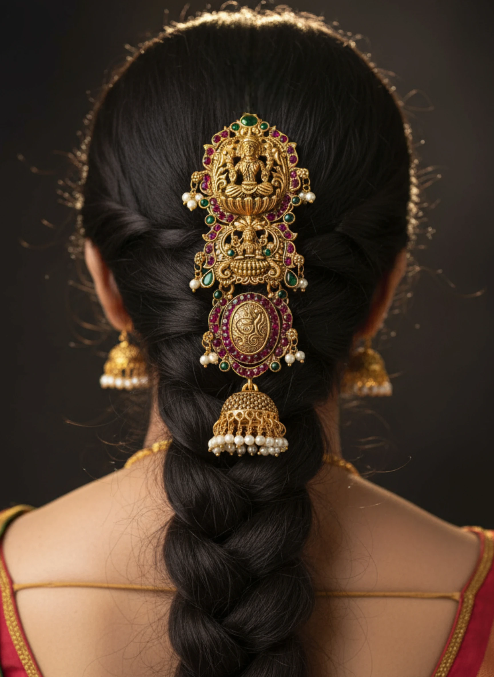 Adorn your tresses with the Jada Pillai hair accessory – a regal temple-inspired piece in gold finish, embellished with emerald green and ruby red stones, tiny pearls, and intricate detailing. Perfect for weddings, festivals, and traditional ceremonies.