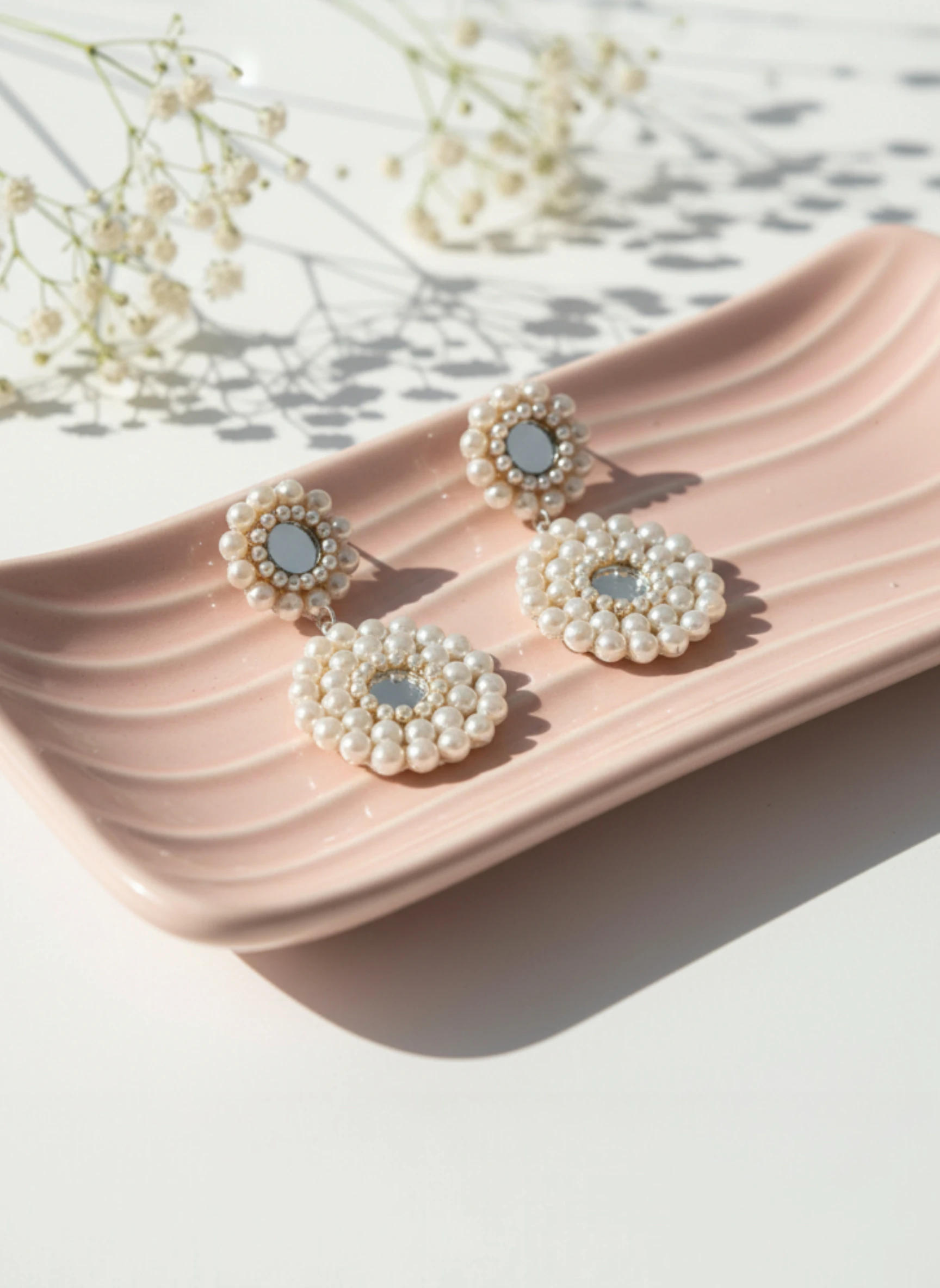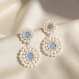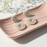 These earrings are carefully constructed on a sturdy base, completely covered by the dense pearl beadwork, giving them a soft yet defined structure. The connection between the top stud and the lower drop is discreet, maintaining the flow of the design. The centerpiece uses a subtle, reflective material—either a polished mirror or a clear glass stone—which provides an unexpected element of shine. The closure is a standard secure push-back post, ensuring they stay perfectly in place. The outdoor photography perfectly captures the fresh, airy feel of the design.