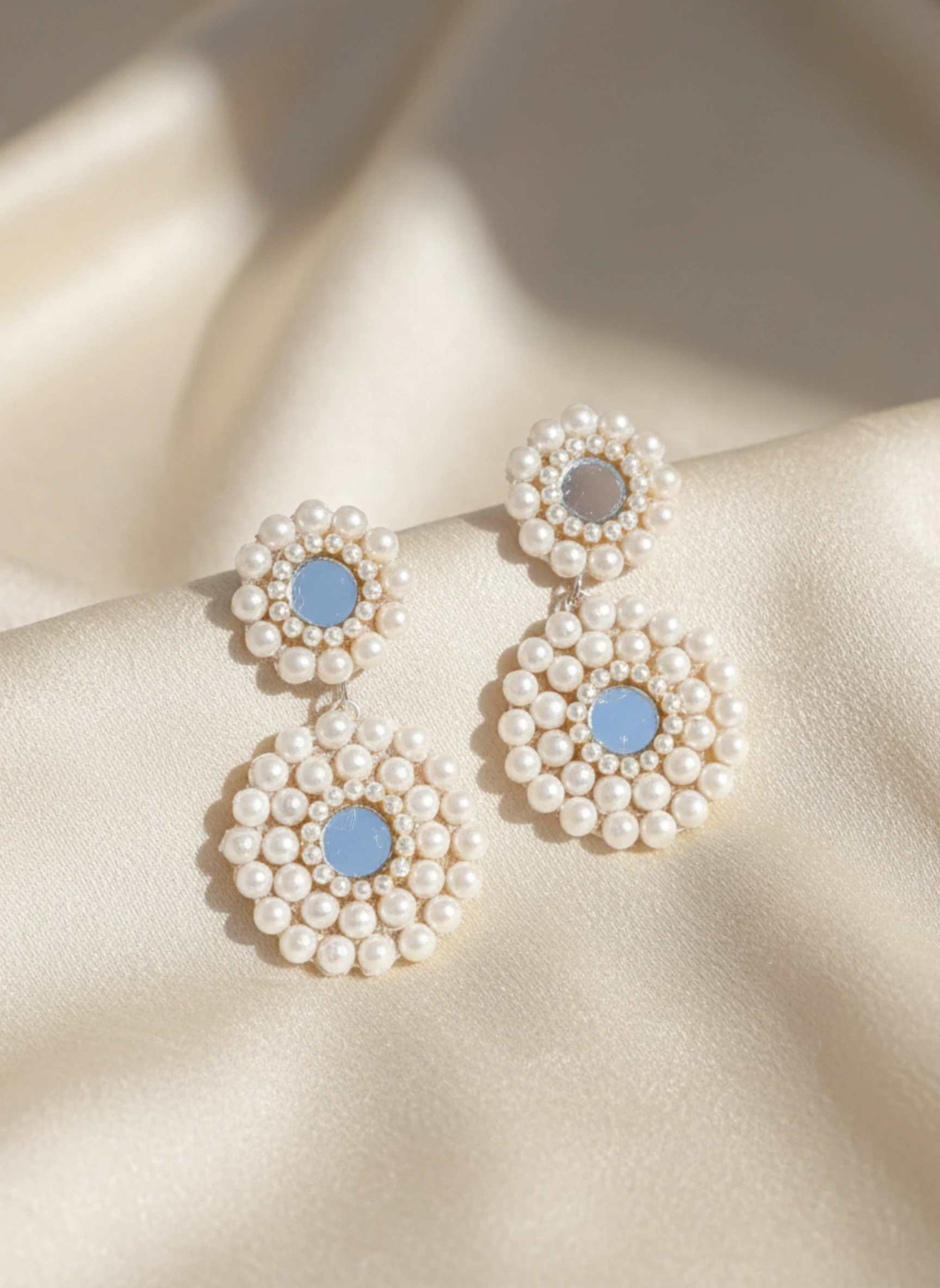 Embrace effortless style with our exquisite Mirror and Pearl Flower Earrings, a contemporary take on traditional Indian craftsmanship. The design showcases meticulous beadwork, where countless tiny white pearls are arranged in a beautiful, symmetrical floral pattern. The centerpiece of both the stud and the larger drop is a captivating, reflective blue/silver mirror or glass inlay that catches the light beautifully. The two components are subtly linked, creating a comfortable stud-style fit with a delicate drop effect. These earrings are exceptionally lightweight, making them ideal for all-day wear. They harmonize perfectly with light, flowing fabrics, pastel ensembles, or fusion wear, offering a fresh, modern aesthetic while retaining a touch of ethnic charm.