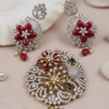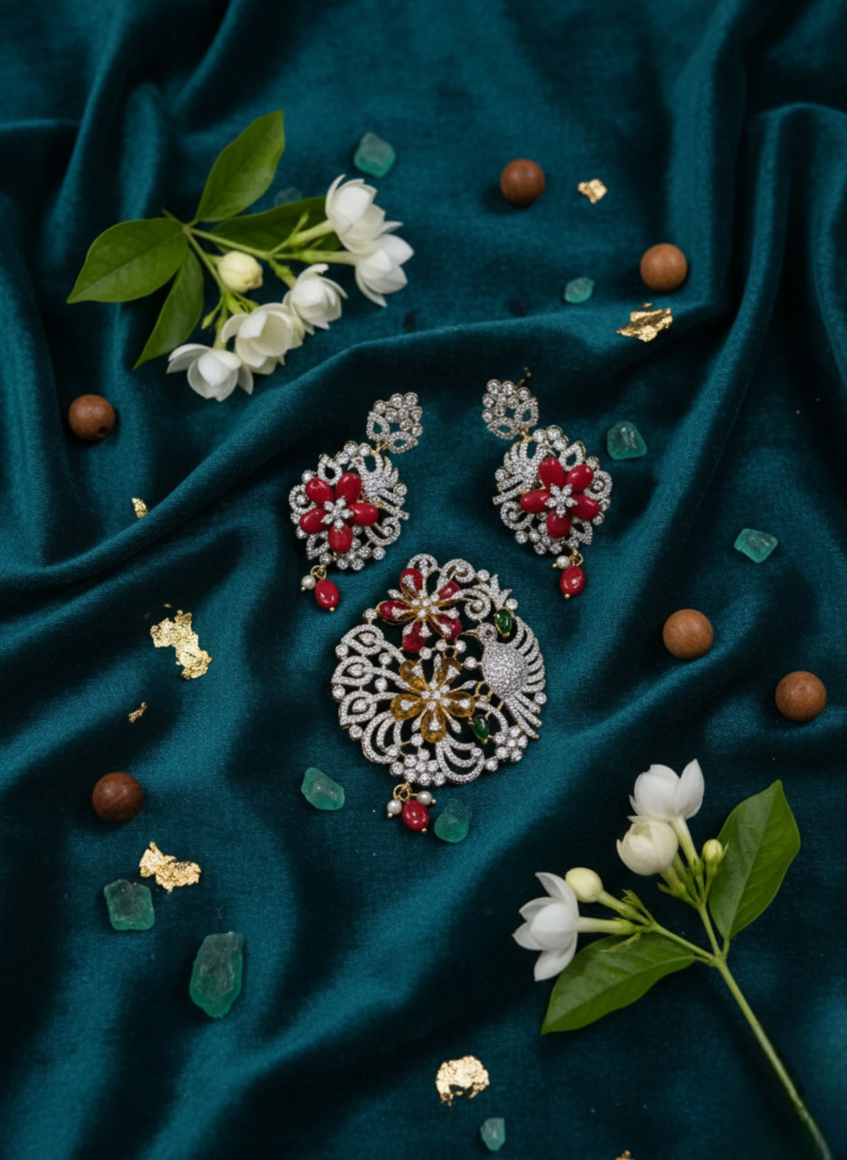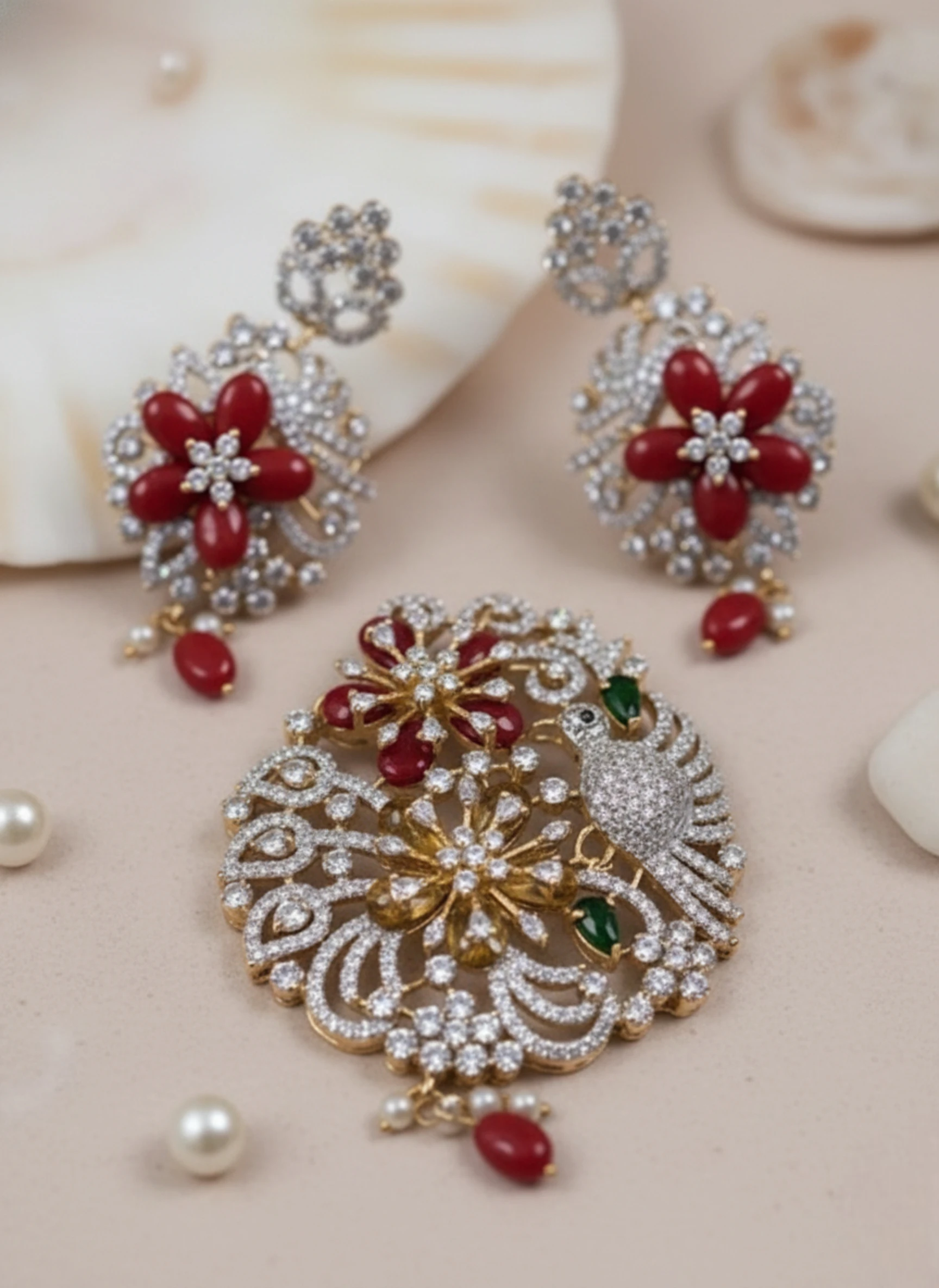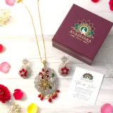 - Earrings: Matching floral earrings with delicate pearl and red bead danglers, designed to perfectly complement the pendant.