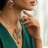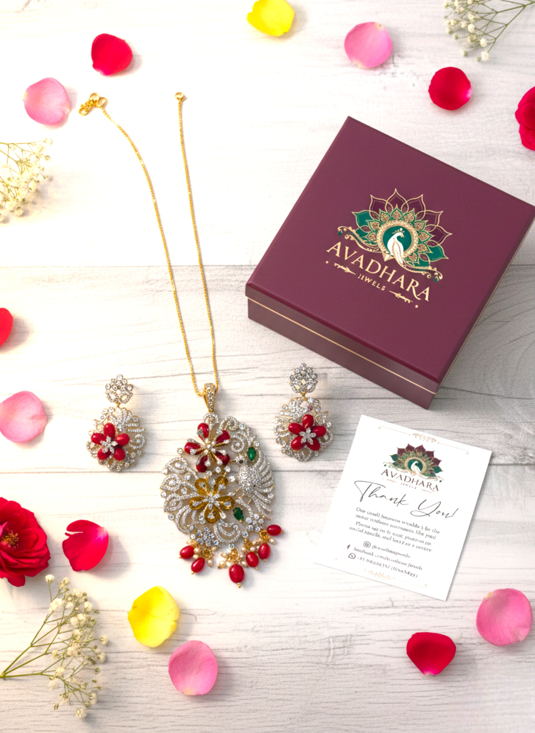 - Earrings: Matching earrings echo the floral-peacock theme, perfectly complementing the pendant for a coordinated festive appeal.