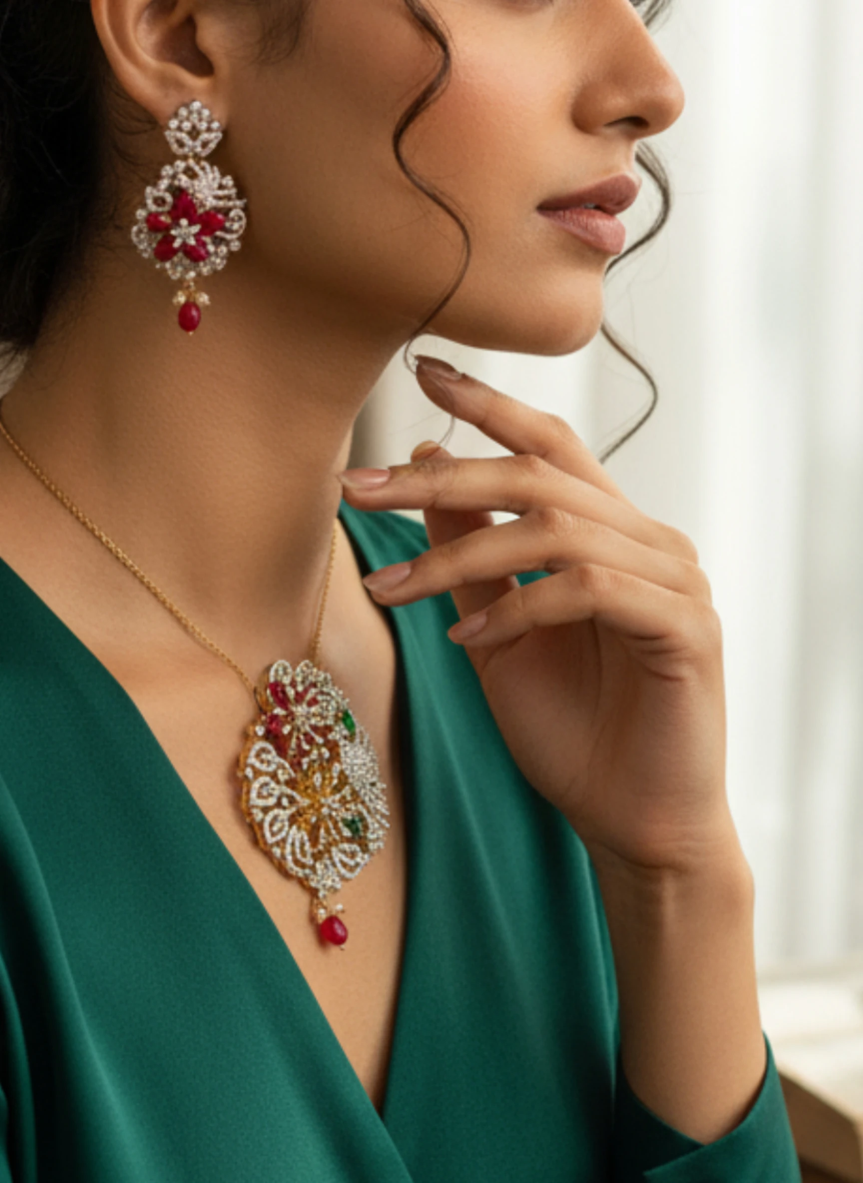 ✨ Pair this pendant set with a silk saree, organza drape, or embellished lehenga for a sophisticated festive look.