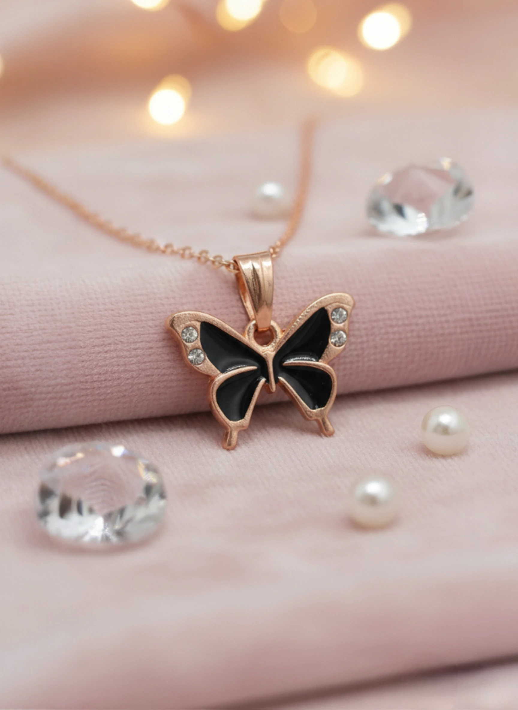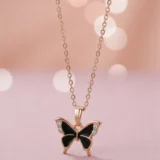 • Chic Color Contrast: Features a striking black butterfly pendant against a radiant rose gold chain.