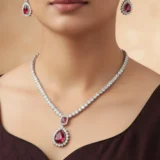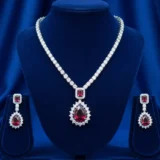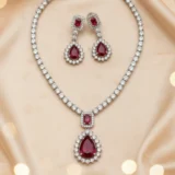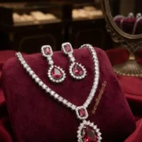 Wear this set with a black velvet gown, a deep maroon lehenga, or a shimmering silver saree to let the ruby red truly stand out. Opt for a sleek hairstyle (like a low bun or a side-swept look) to showcase the sparkle of the earrings and the graceful curve of the necklace. Since the set is already a strong statement, keep other jewelry minimal—a single CZ ring is all you need.