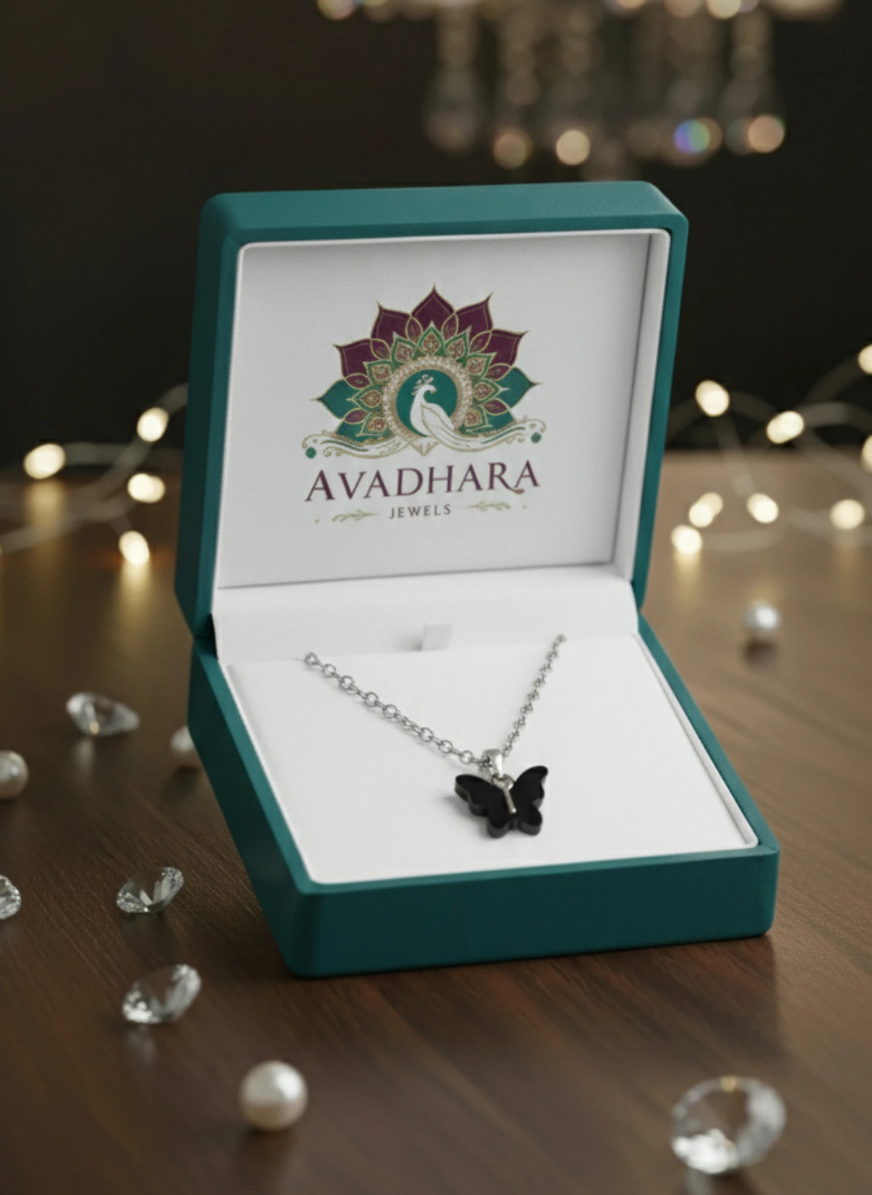 The focal point of this captivating necklace is the meticulously crafted butterfly pendant, featuring a smooth, solid black finish on its wings. This deep, lustrous black hue provides a stunning contrast against the cool, radiant glow of the silver-toned chain and hardware. The design is clean and minimalist, allowing the elegant silhouette of the butterfly and the luxurious finish to make a subtle yet impactful statement. The pendant is gracefully suspended from a delicate yet durable silver-toned stainless steel chain, ensuring comfortable wear and a refined feel. This piece embodies a versatile aesthetic that complements both traditional Indian attire and modern Western outfits with equal grace.