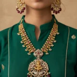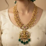 Crafted by skilled artisans, every detail — from the fine carvings to the smooth beadwork — reflects India’s rich jewellery heritage. This necklace set complements sarees, silk lehengas, and ethnic outfits, making it a must-have for weddings, festive celebrations, and temple visits.