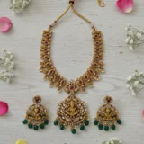 An exquisite antique gold temple jewellery set featuring Goddess Lakshmi, adorned with CZ stones, ruby accents, and green bead drops — perfect for weddings, festive occasions, and traditional celebrations.