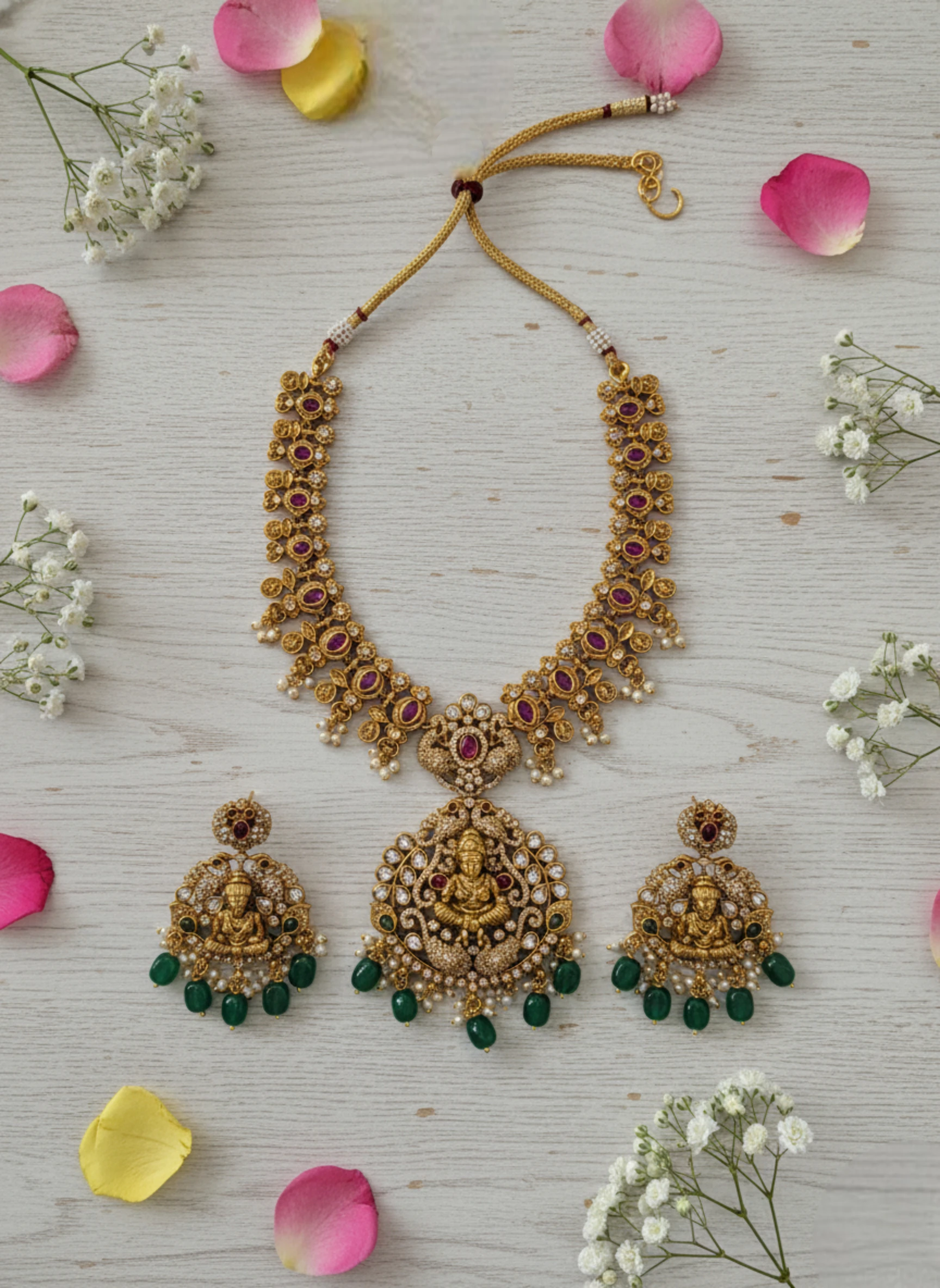 - Pendant Design: Central Lakshmi motif symbolizing wealth and blessings, surrounded by intricate nakashi work.