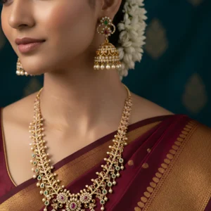 Ruby Emerald Long Haram Necklace Set with Jhumka Earrings – Bridal Temple Jewelry