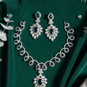 Add a touch of royal elegance to your look with our stunning blue stone and diamond-look jewelry set. A timeless piece that`s perfect for brides or party wear.