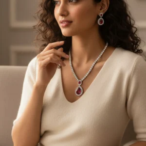 The Shahi Ruby Solitaire Necklace Set is crafted to make every moment feel majestic — radiant ruby tones framed with shimmering CZ brilliance for a truly royal look.